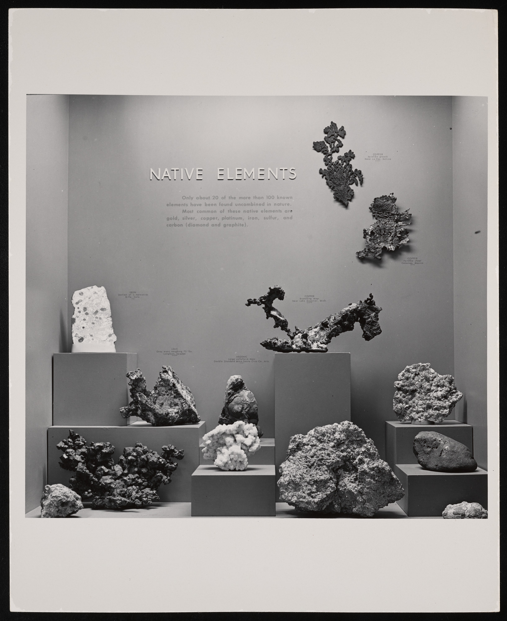 Gems and minerals exhibit case in the Museum of Natural History, featuring "Native Elements."