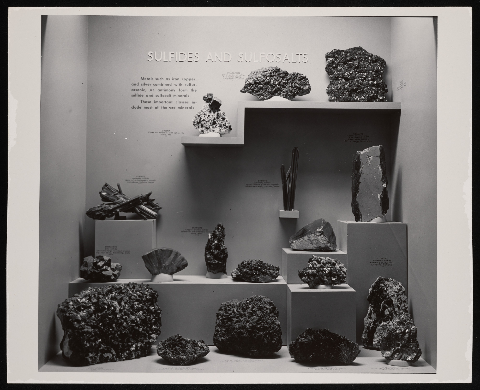 Gems and minerals exhibit case in the Museum of Natural History, featuring "Sulfides and Sulfosalts."