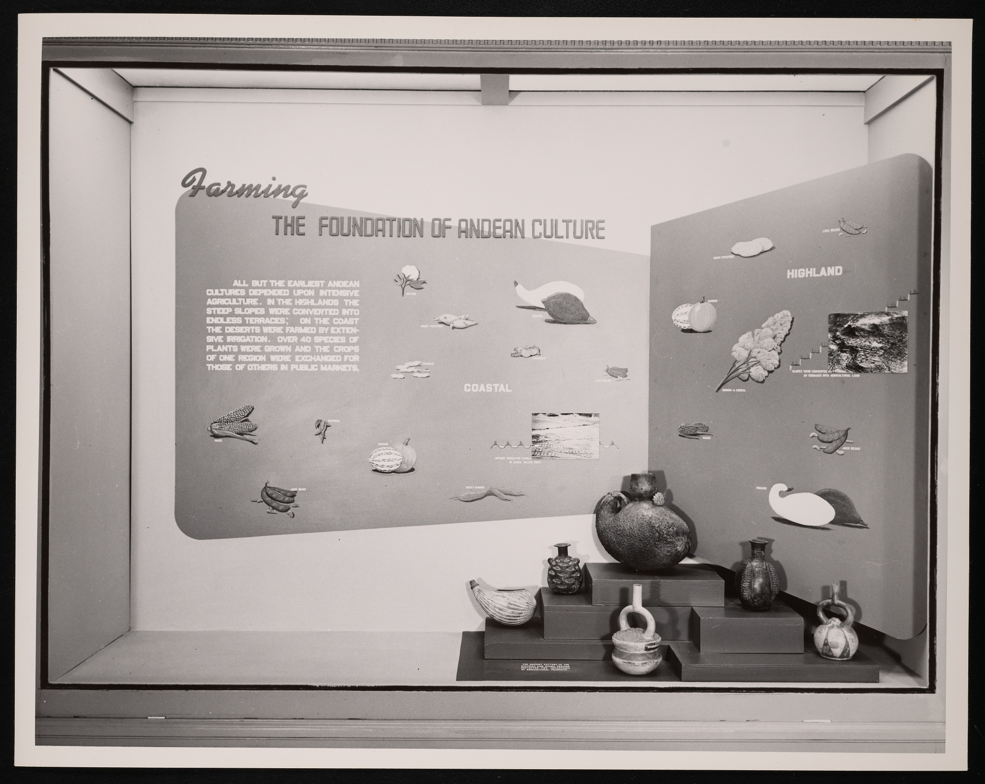 Exhibit case, United States National Museum "Highlights of Latin American Archeology" exhibition in Hall 23 of the Natural History Building, now known as the National Museum of Natural History, featuring "Farming: The Foundation of Andean Culture."