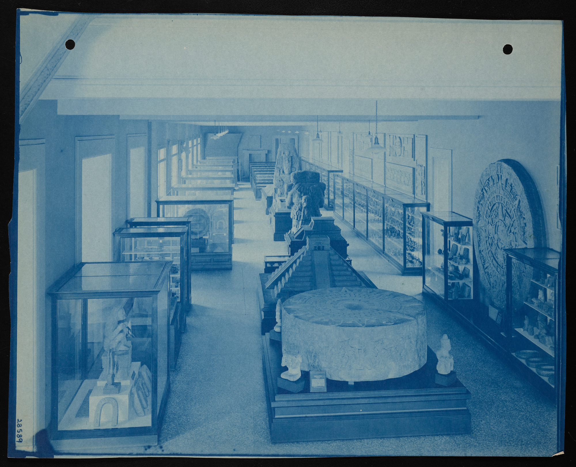 Interior view, United States National Museum archeology exhibits in the Natural History Building, now known as the National Museum of Natural History, featuring antiquities of Mexico, including a cast of the Aztec Calendar Stone.