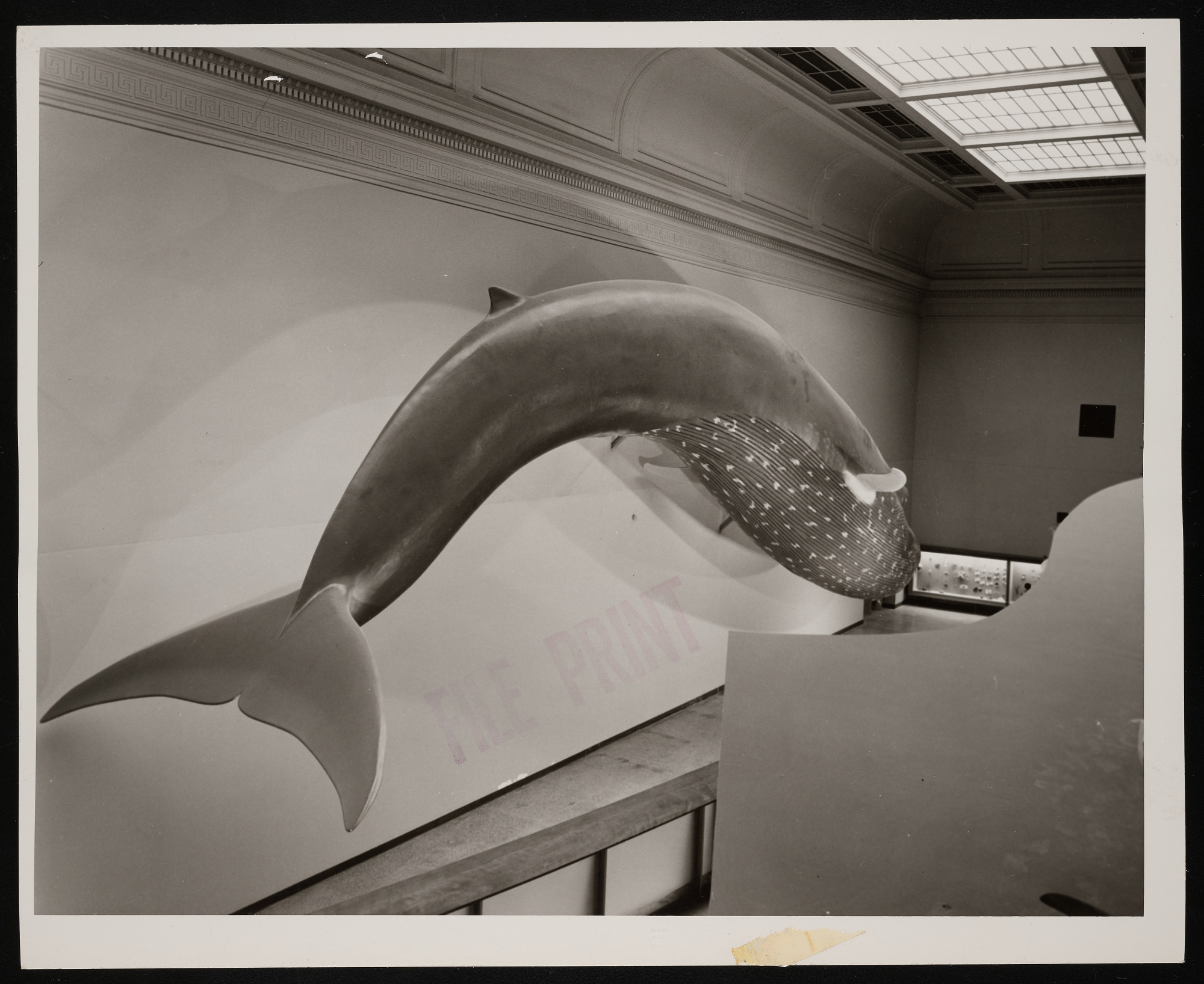 Interior view, Hall of Life in the Sea at Museum of Natural History, featuring life-sized model of a blue whale after installation.