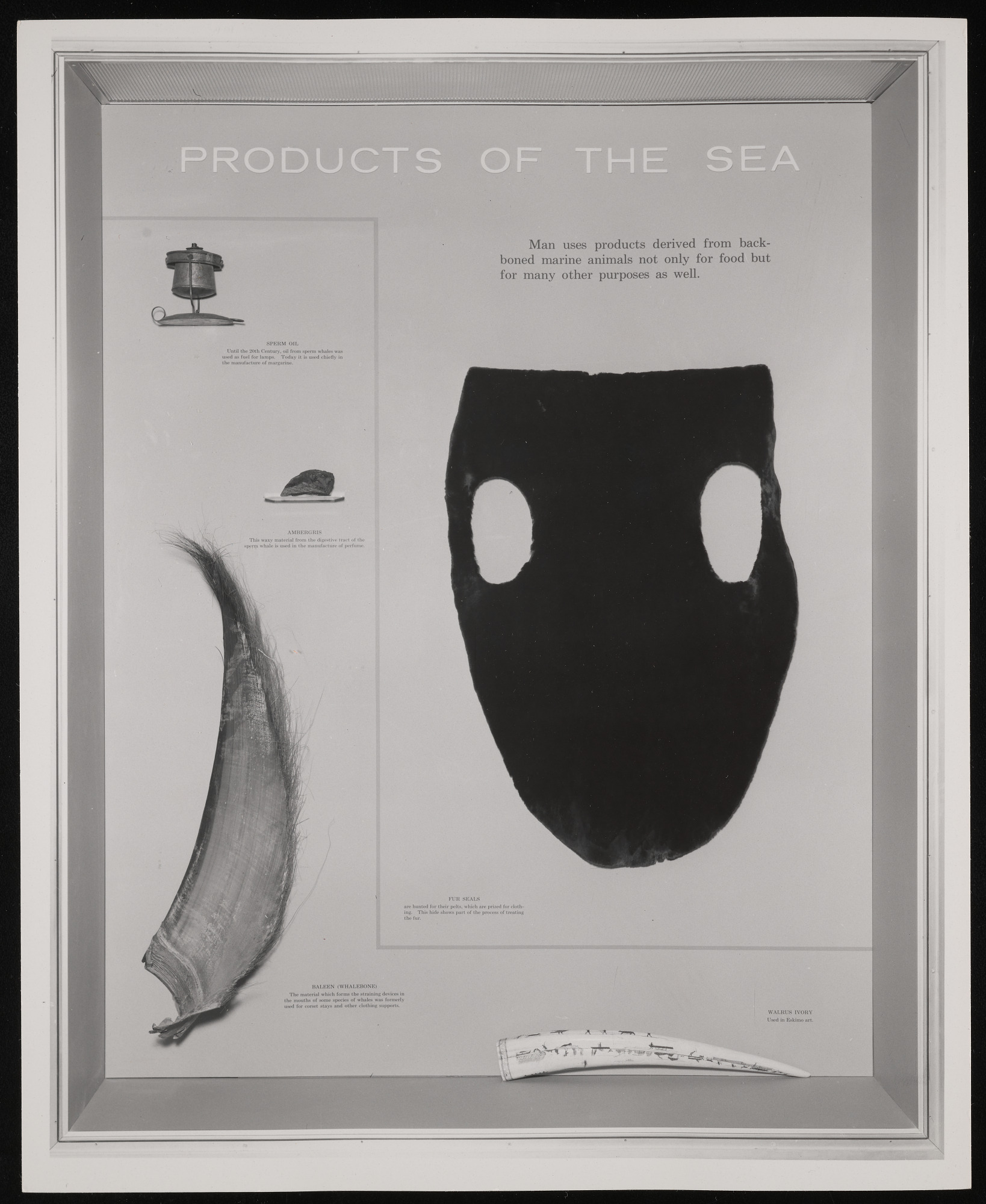 Exhibit case in Hall of Life in the Sea at Museum of Natural History, featuring "Products of the Sea."