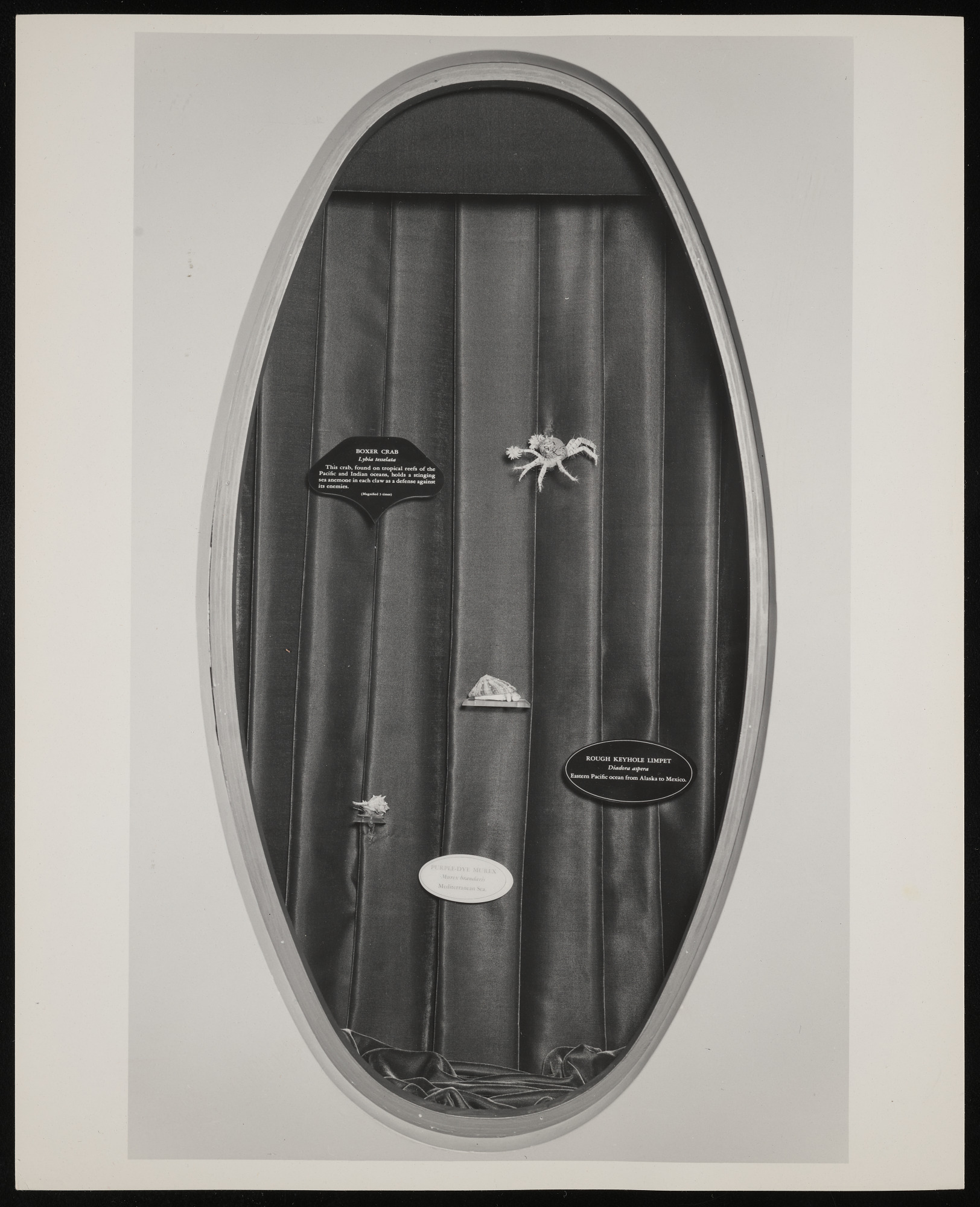 Exhibit case in Hall of Life in the Sea at Museum of Natural History, featuring "Boxer Crab," "Rough Keyhole Limpet," and "Purple-Dye Murex."