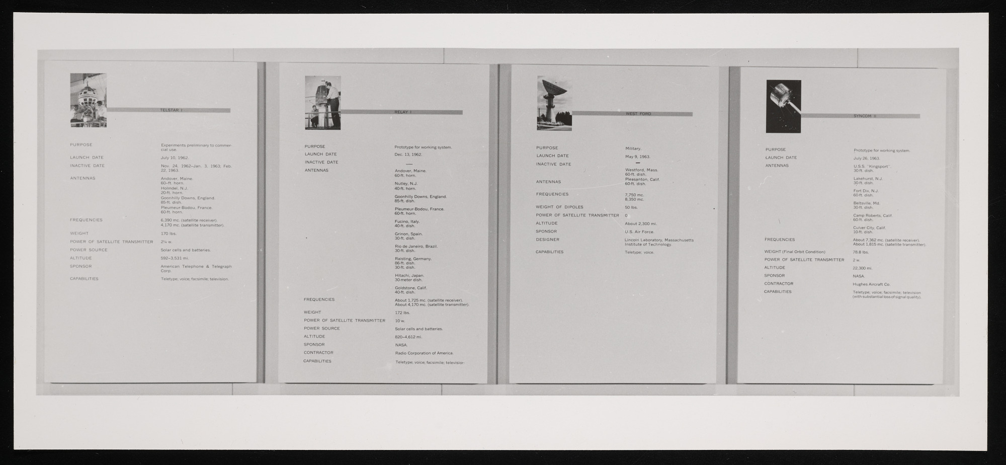 "Communications in Space" exhibit panels at Museum of History and Technology, now known as National Museum of American History, featuring examples of the first eight communication satellites, including Telstar 1, Relay 1, West Ford, and Syncom II.