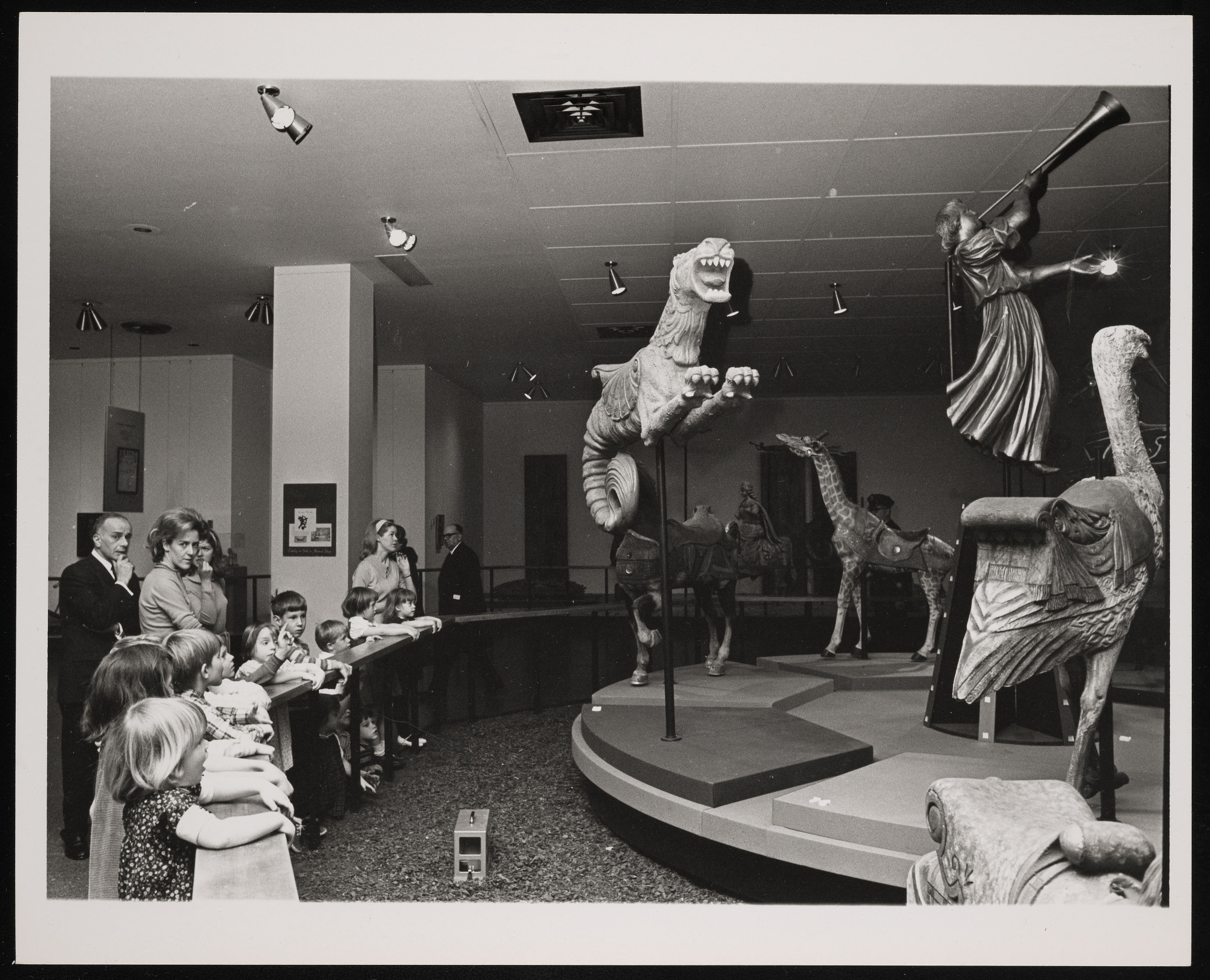 Silvio Bedini, assistant director of Museum of History and Technology, now known as National Museum of American History, conducts a tour for students of the White House school, featuring carved carousel animals from the Eleanor and Mabel Van Alstyne American Folk Art Collection.