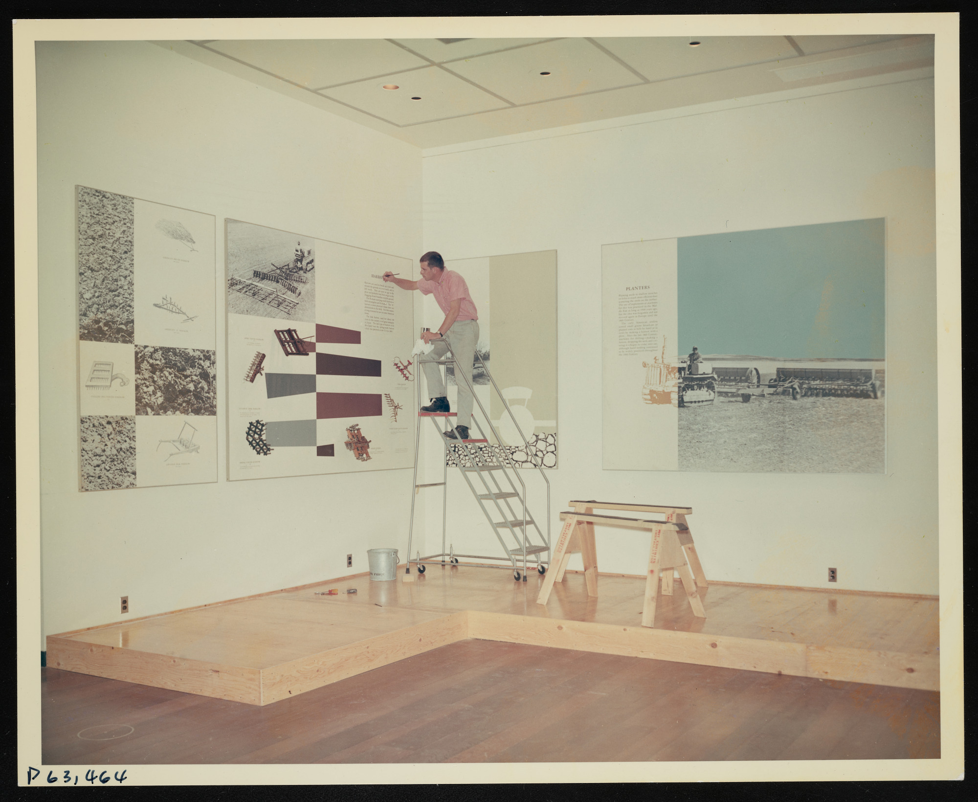 Interior view, Richard A. Wilder, exhibits specialist, touches up wall panels before installation of objects in the Hall of Farm Machinery at Museum of History and Technology, now known as National Museum of American History.