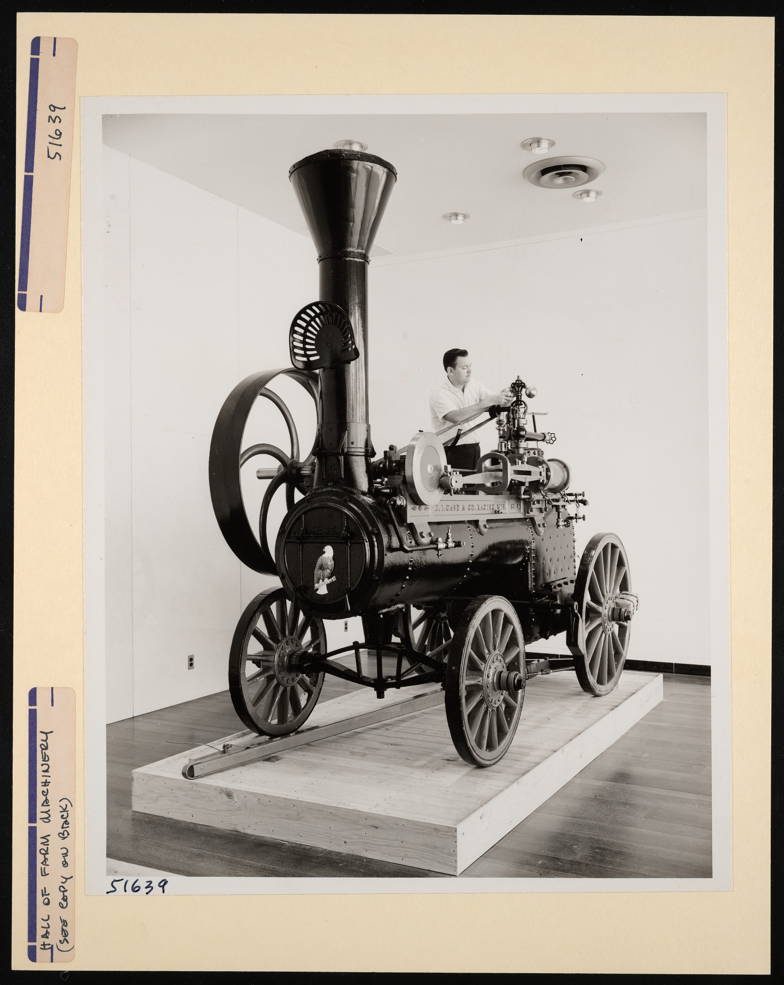Interior view, Joseph W. Saunders, assistant supervisory exhibits specialist, adjusts an early steam engine in the Hall of Farm Machinery at Museum of History and Technology, now known as National Museum of American History.