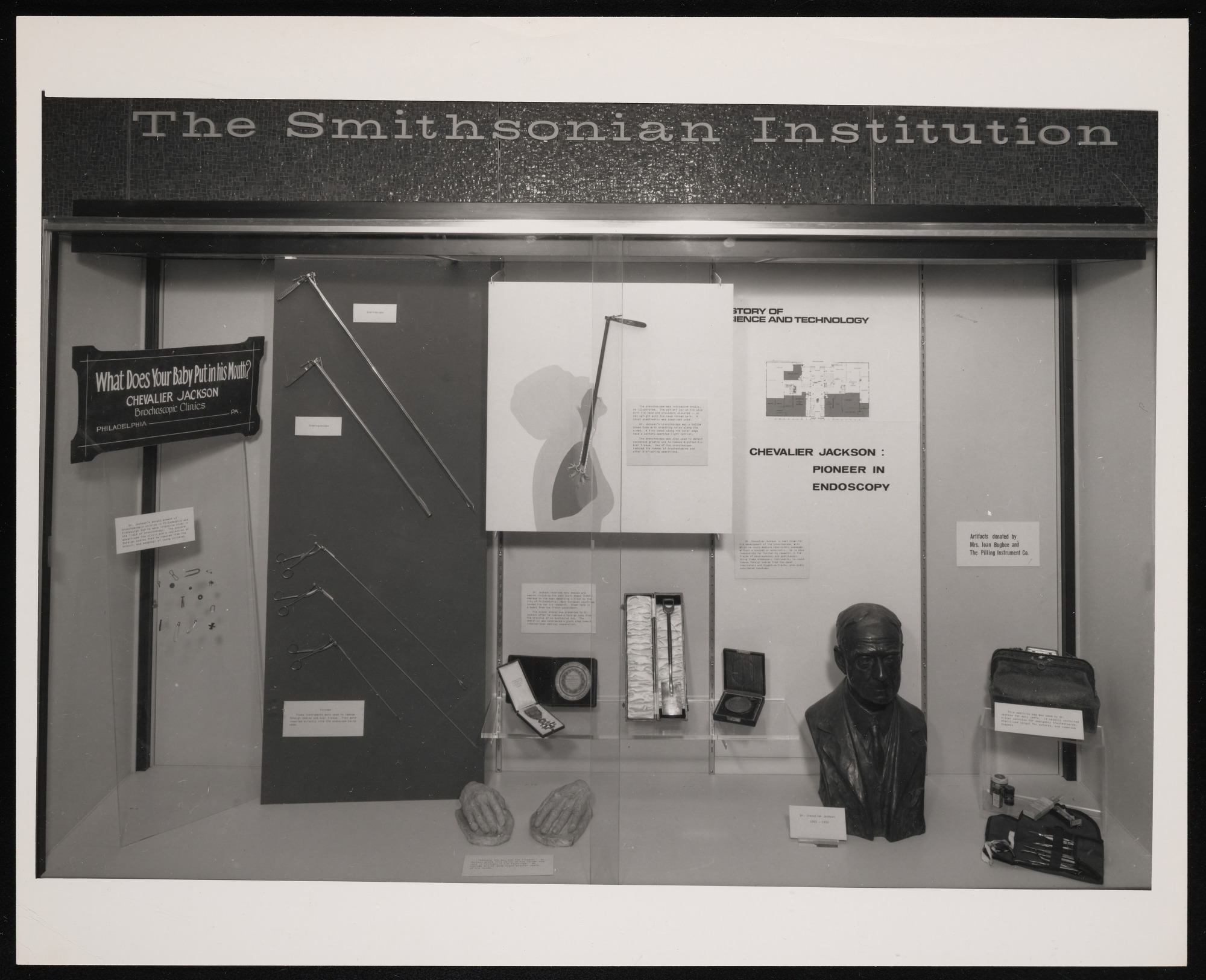 Monthly exhibit case in the lobby of National Museum of History and Technology, now known as National Museum of American History, featuring "Chevalier Jackson: Pioneer in Endoscopy."