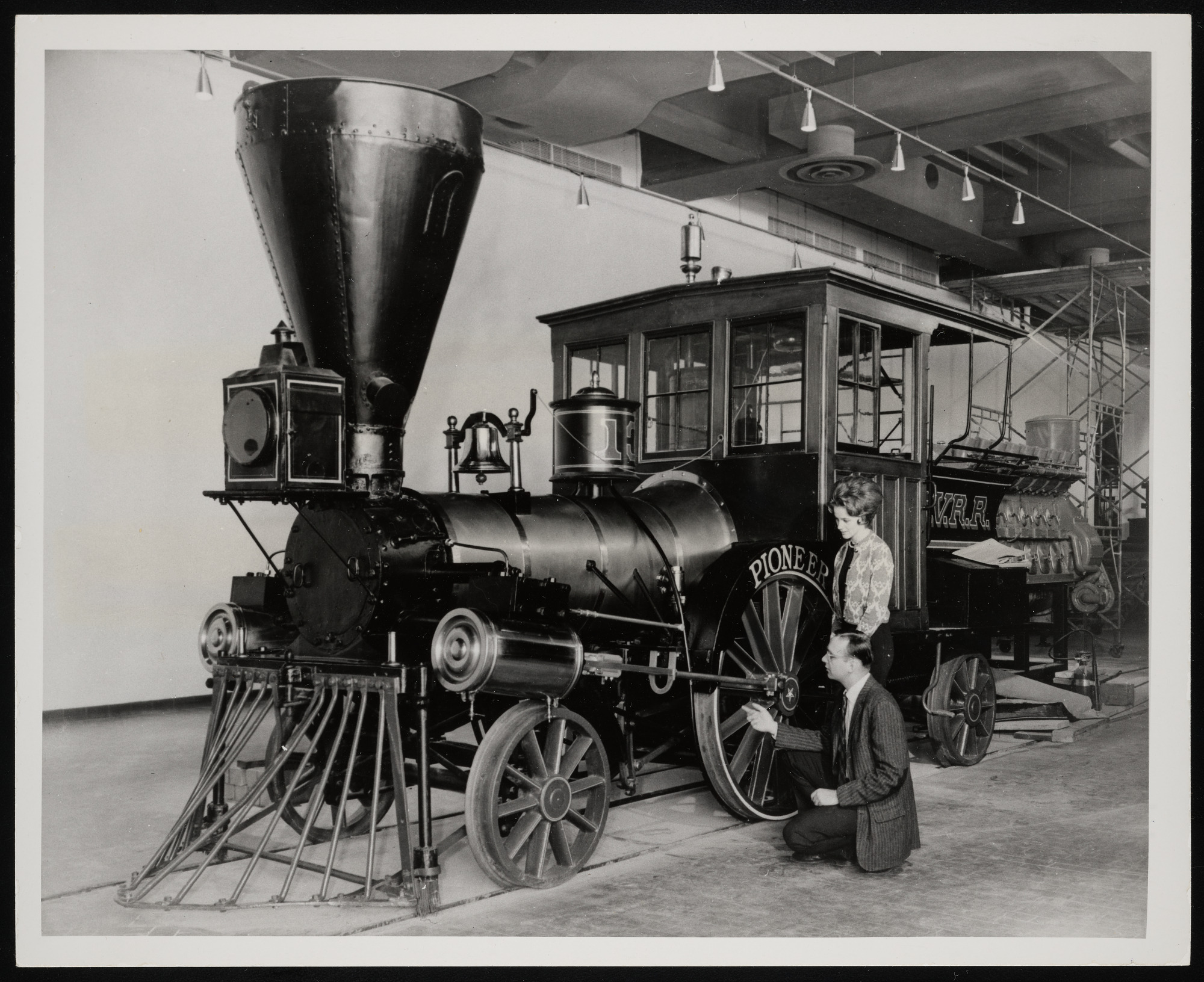 Interior view, final installation of "Pioneer" locomotive in Railroad Hall at Museum of History and Technology, now known as National Museum of American History, with John H. White, associate curator in the Section of Land Transportation, and Mary S. Chroniger, secretary.