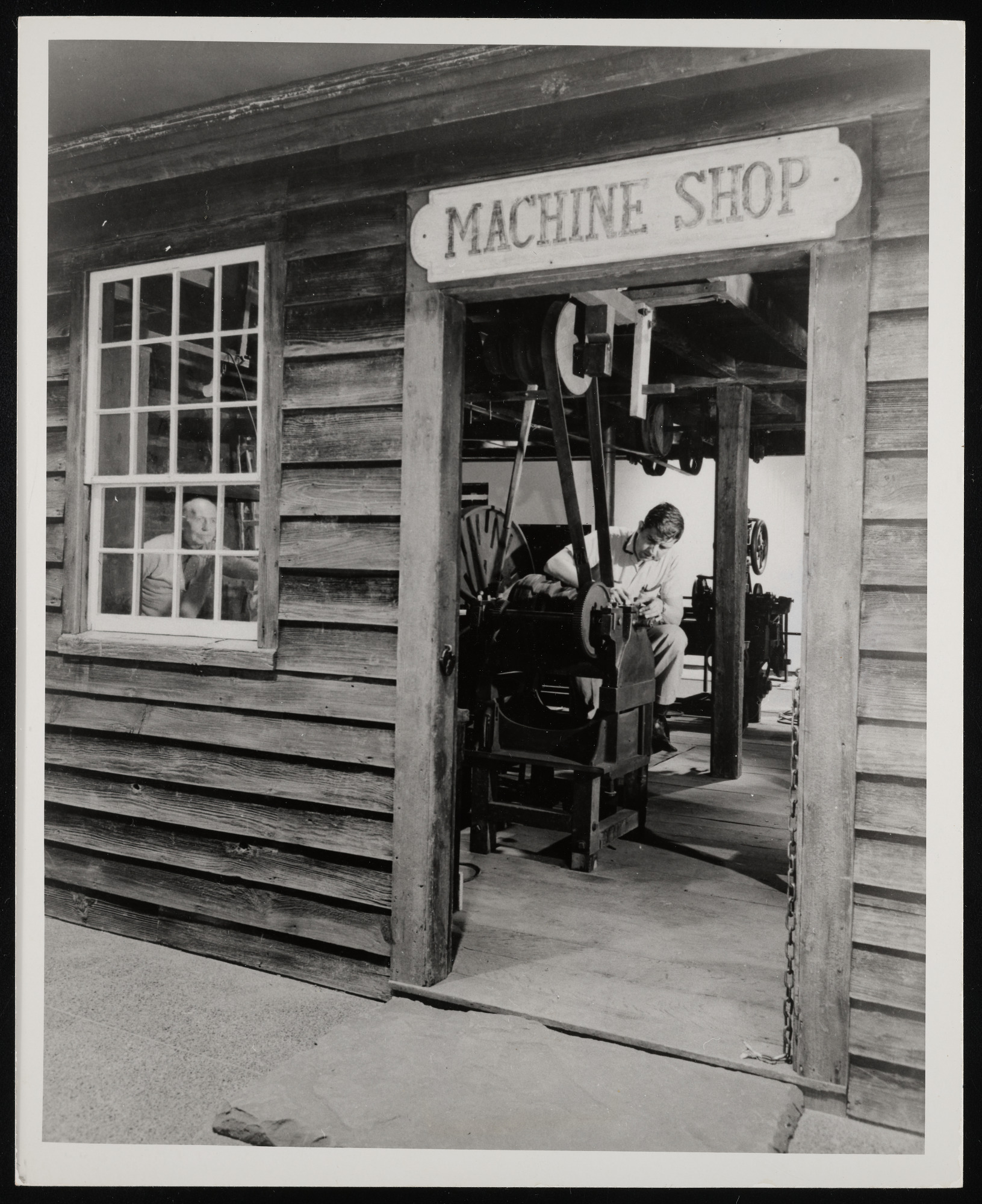 Interior view, reconstructed full-size Machine Shop of about 1855, equipped with some of the oldest machine tools in the collection, in Hall of Tools at Museum of History and Technology, now known as National Museum of American History, showing final installation of machines by Edward A. White, millwright, and William K. Henson, machinist.