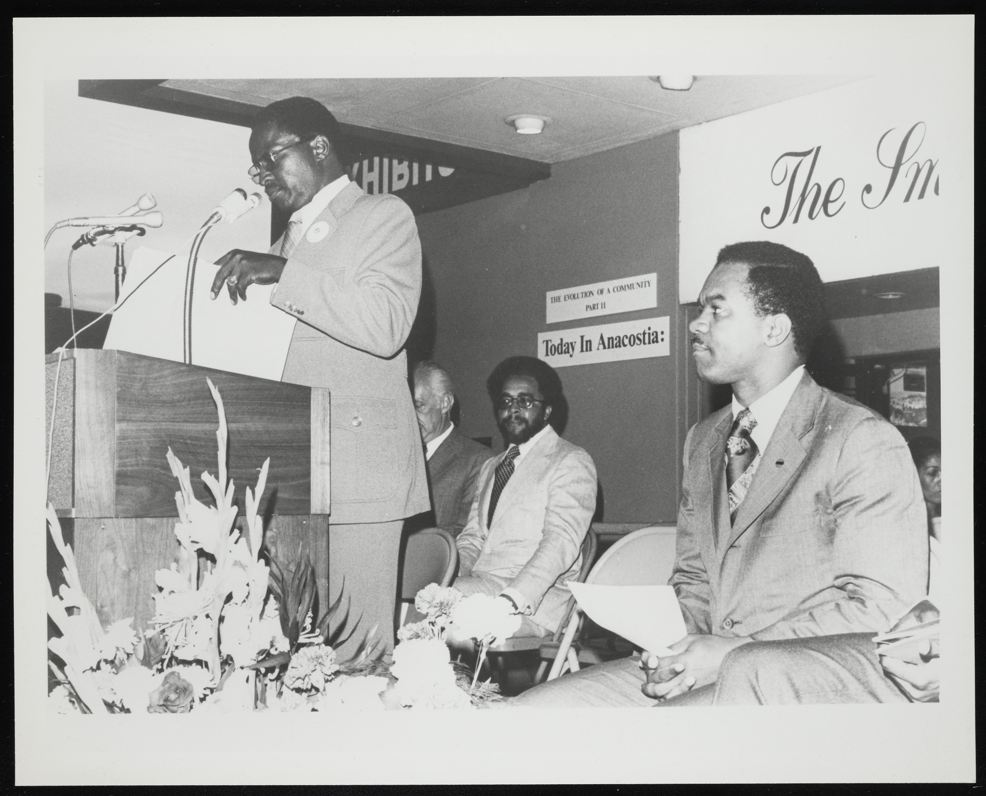 Speakers at the fifth anniversary celebration of the Anacostia Neighborhood Museum, now known as Anacostia Community Museum, with Stanley Anderson (at podium), D.C. City Councilman; Robert Angus Brooks, Assistant Secretary; Julian Euell, Acting Assistant Secretary for Public Service; and Walter Fauntroy, D.C. Delegate to Congress.