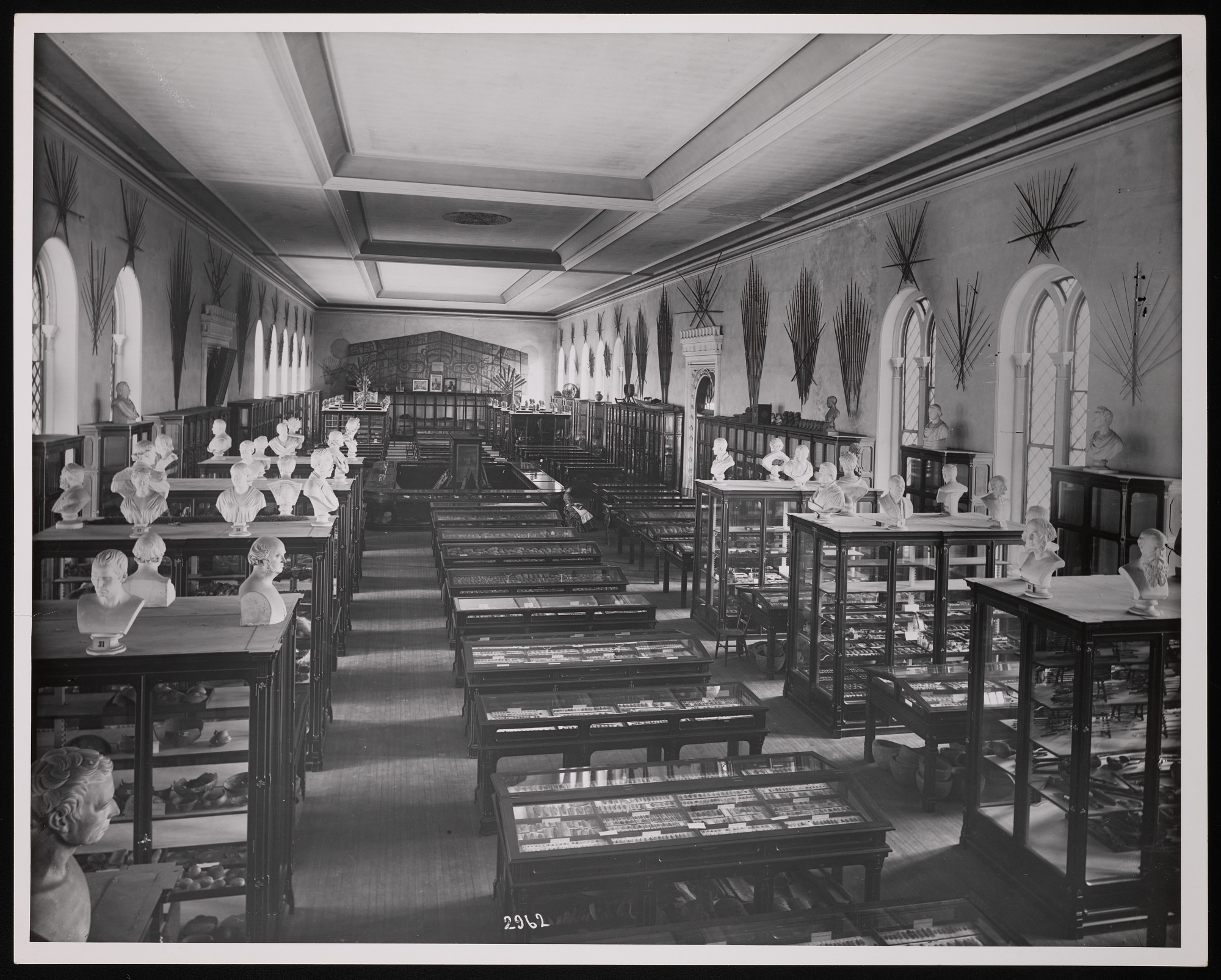 Interior view, Upper Main Hall of the Smithsonian Institution Building, or Castle, looking west, with prehistoric archeology and anthropology exhibits, including a Tsimshian house front, acquired from the Northwest Coastal Indians for display at the Philadelphia Centennial Exhibition in 1876.
