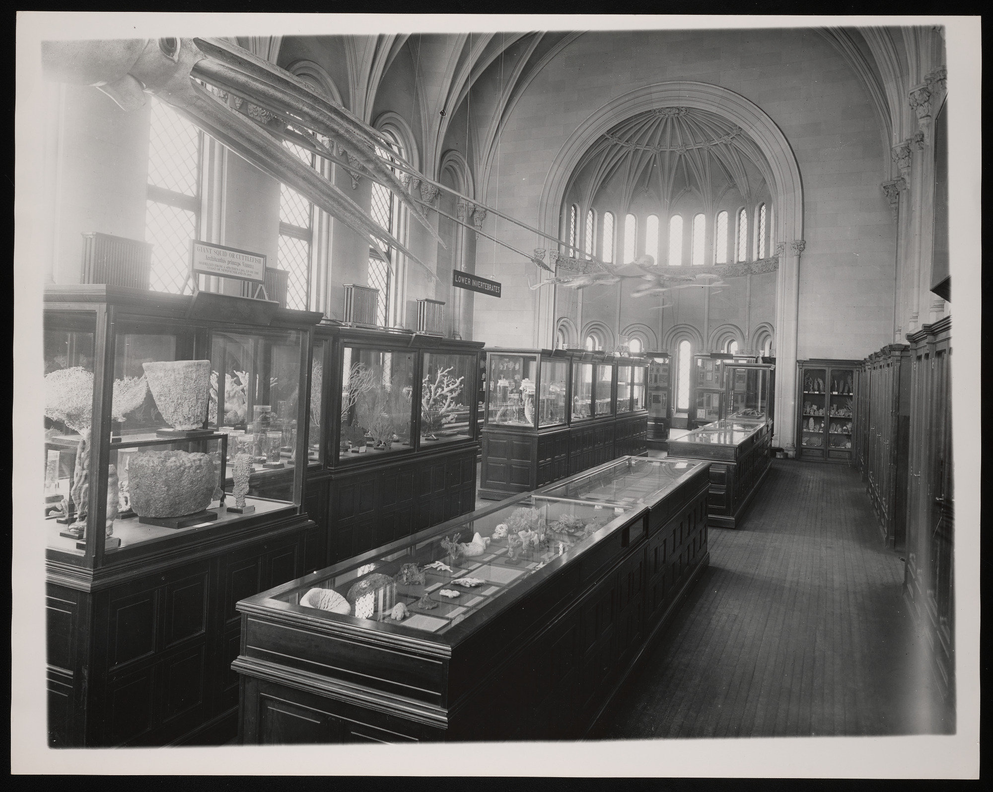 Interior view of the west wing, also known as the chapel, of the Smithsonian Institution Building, or Castle, showing marine invertebrates exhibits.