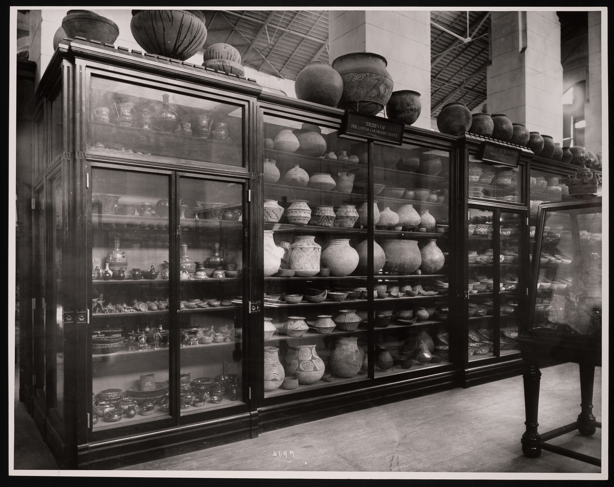 Interior view, anthropology exhibits in the United States National Museum, now known as the Arts and Industries Building, featuring "Tribes of the Lower Colorado Valley" pottery.