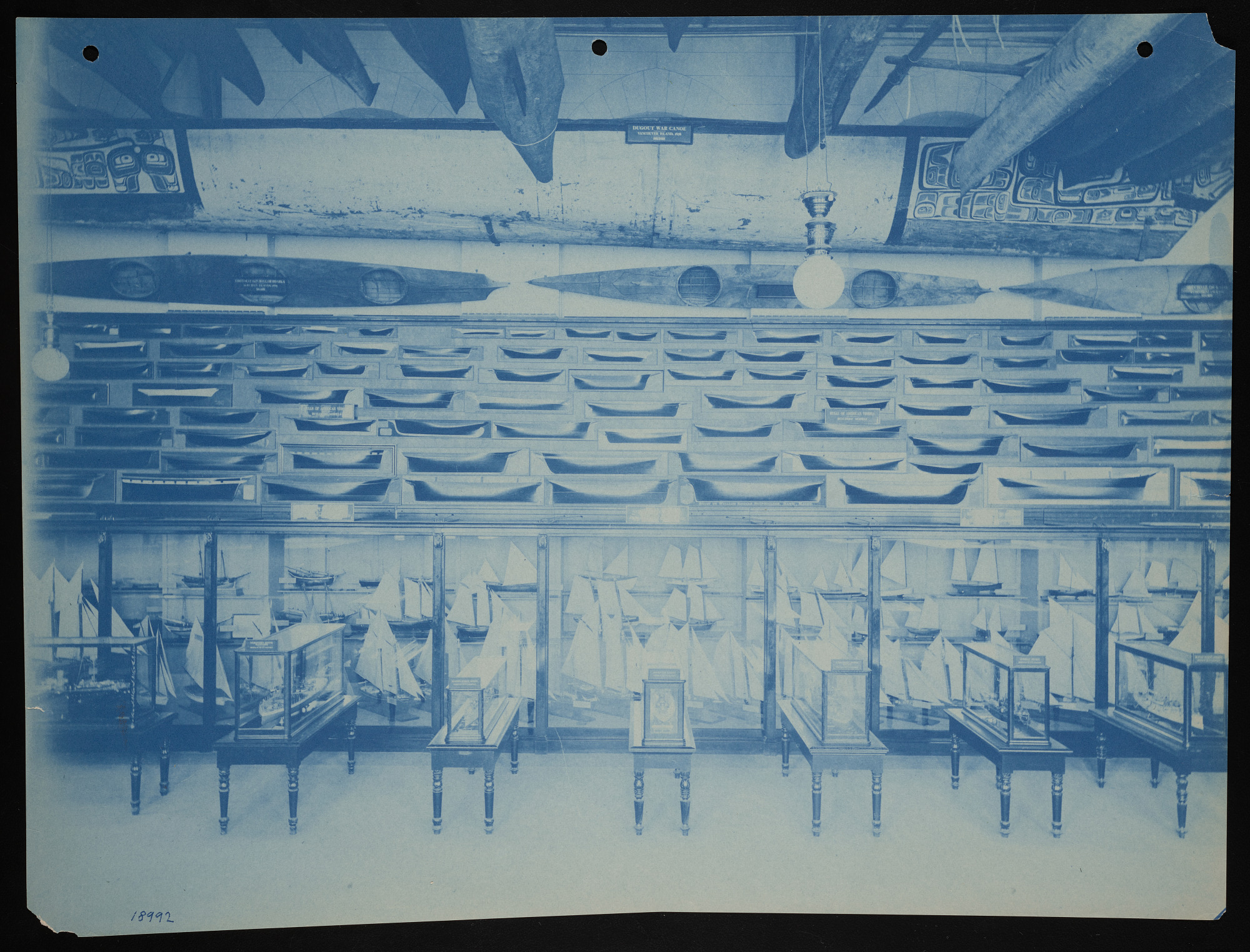 Interior view, water transportation exhibits in Boat Hall in the North East Range of the United States National Museum, now known as the Arts and Industries Building, featuring water craft of the world, boats, boat models, and ship models.