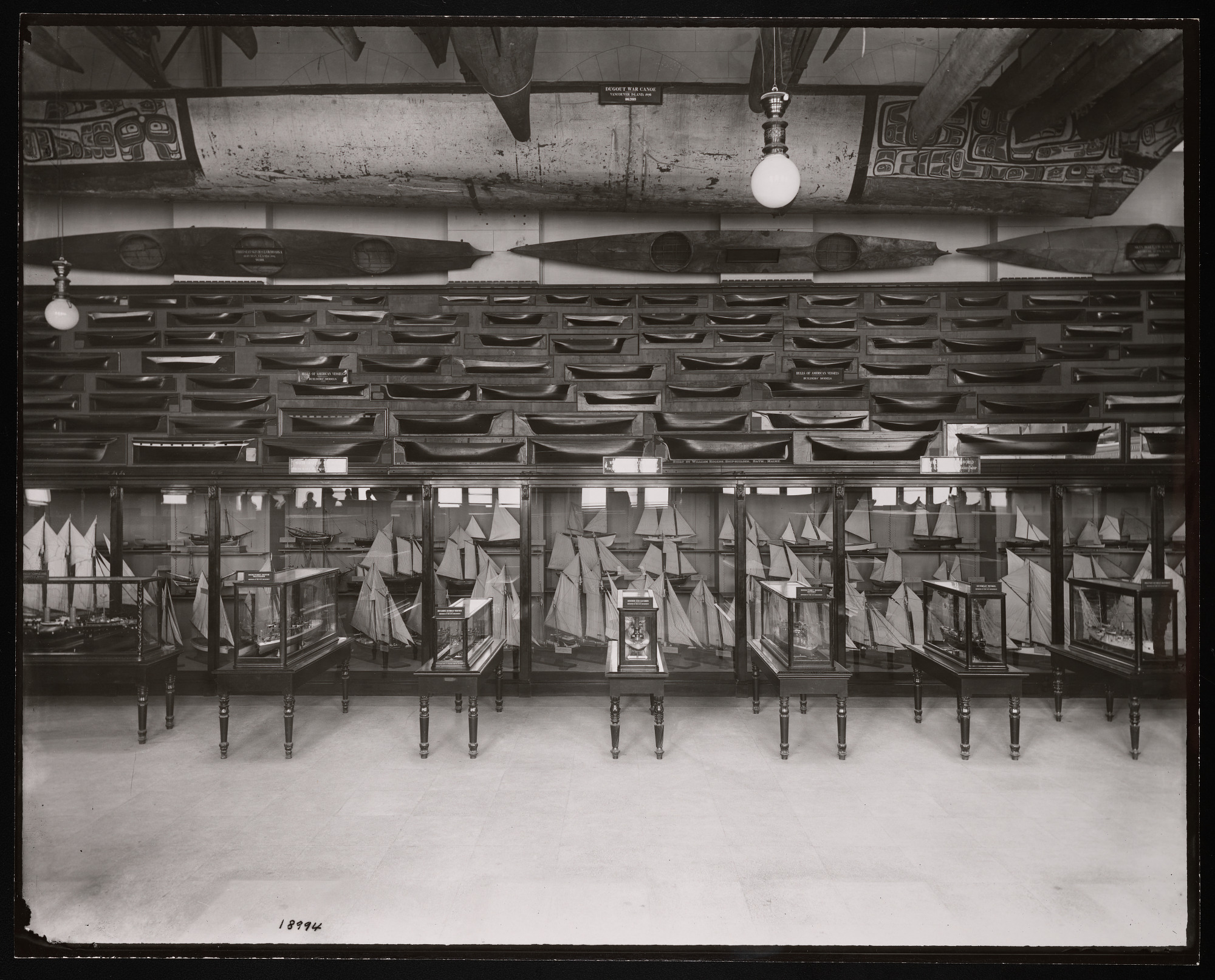 Interior view, water transportation exhibits in Boat Hall in the North East Range of the United States National Museum, now known as the Arts and Industries Building, featuring water craft of the world, boats, boat models, and ship models.