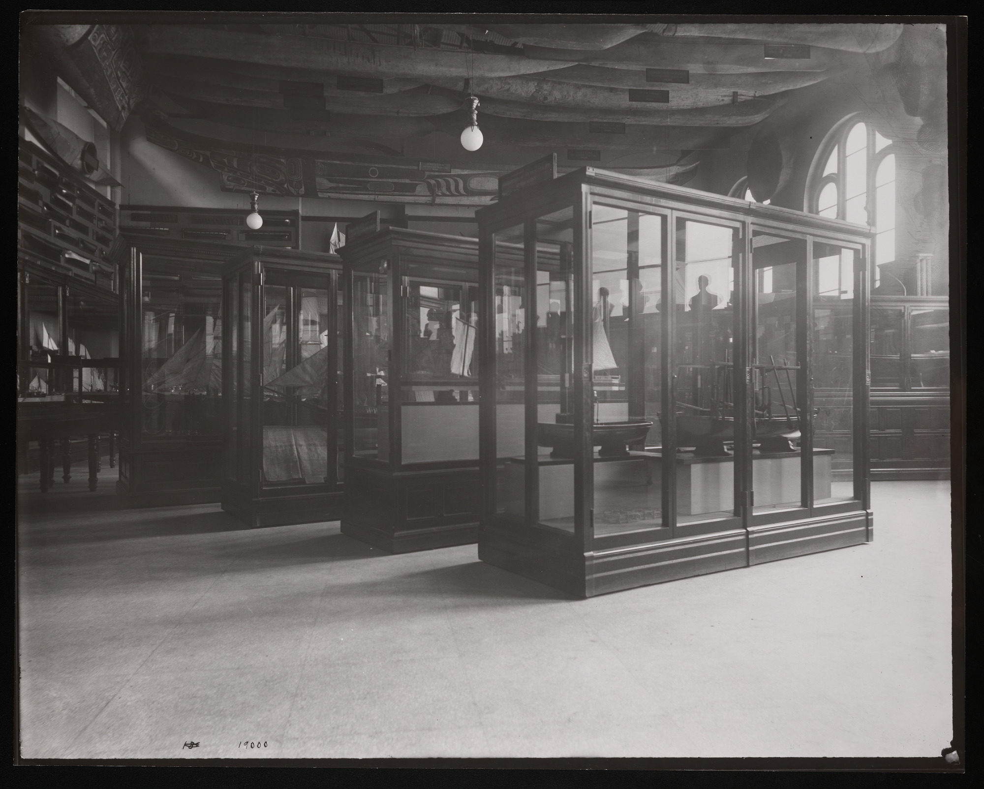 Interior view, water transportation exhibits in Boat Hall in the North East Range of the United States National Museum, now known as the Arts and Industries Building, featuring water craft of the world, boats, boat models, and ship models.
