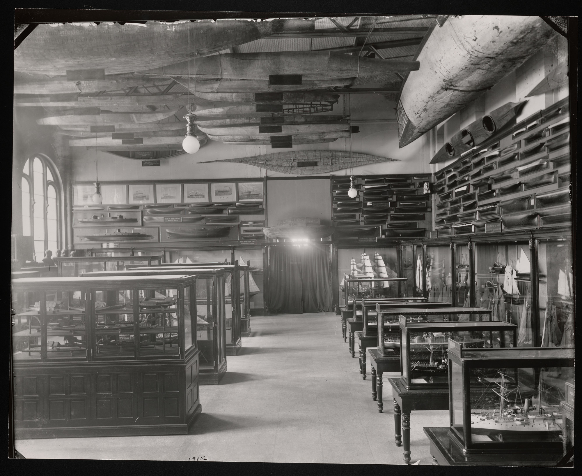 Interior view, water transportation exhibits in Boat Hall in the North East Range of the United States National Museum, now known as the Arts and Industries Building, featuring water craft of the world, boats, boat models, and ship models.