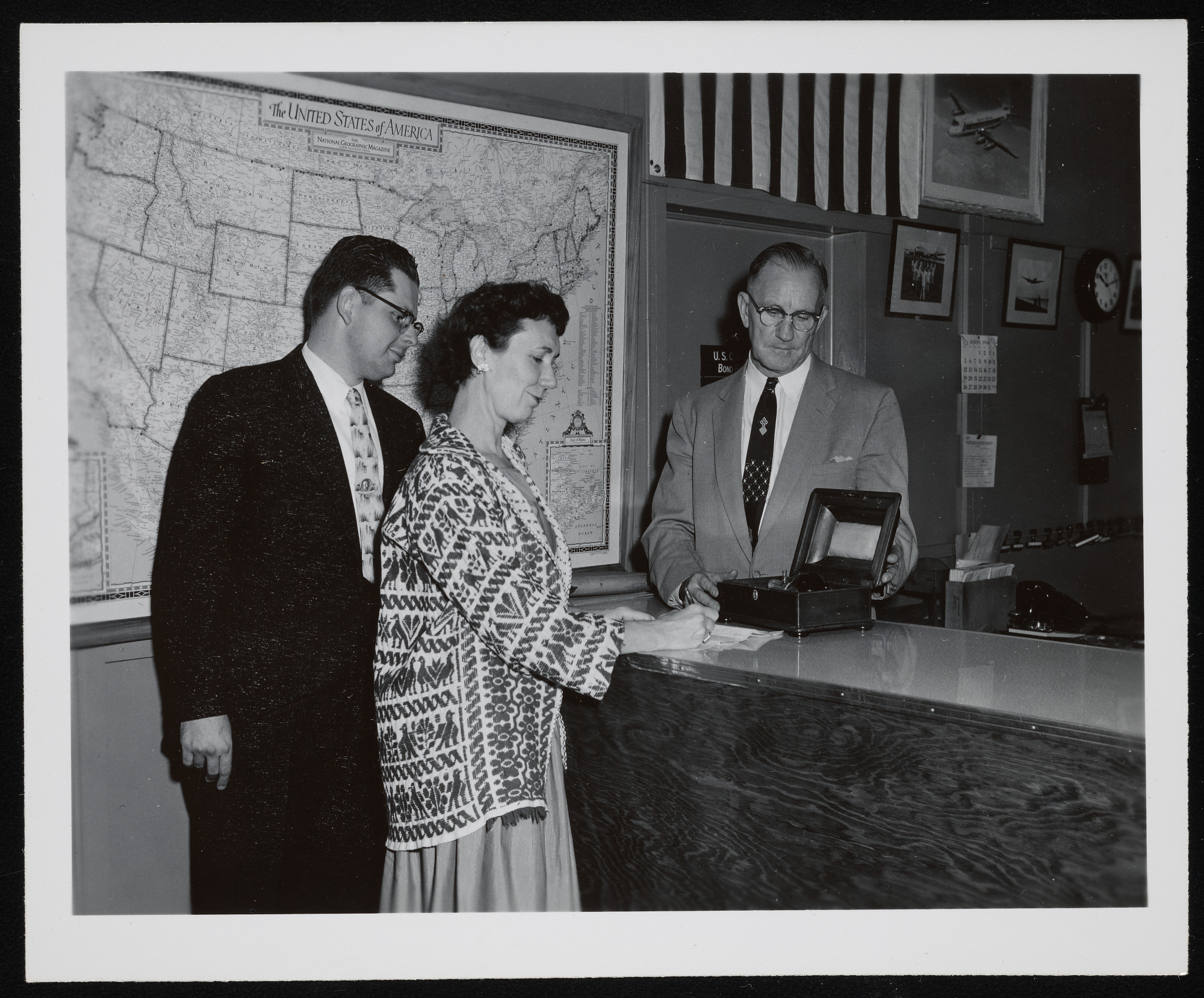Presentation of Roentgen x-ray tube to United States National Museum by General Electric Company at Washington National Airport, with (left to right) George B. Griffenhagen, curator of medicine and public health; Helena Weiss, registrar, United States National Museum; and a staff member from the airport Customs Office.