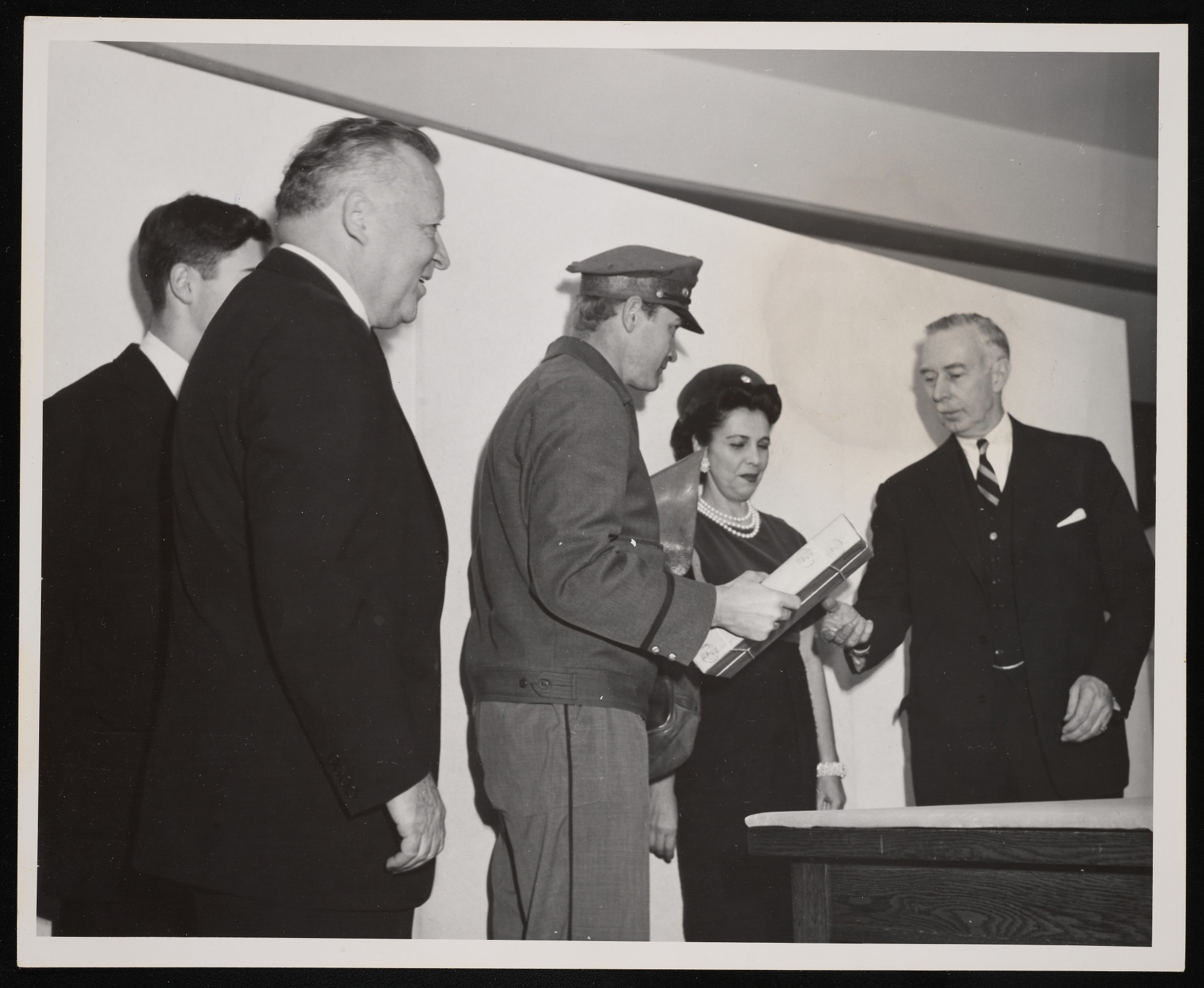 Presentation of Hope Diamond to Museum of Natural History by jeweler Harry Winston, with Postmaster General Arthur Summerfield, Ronald Winston, United States Postal Service letter carrier James G. Todd, Edna Fleishman Winston, and Secretary Leonard Carmichael.