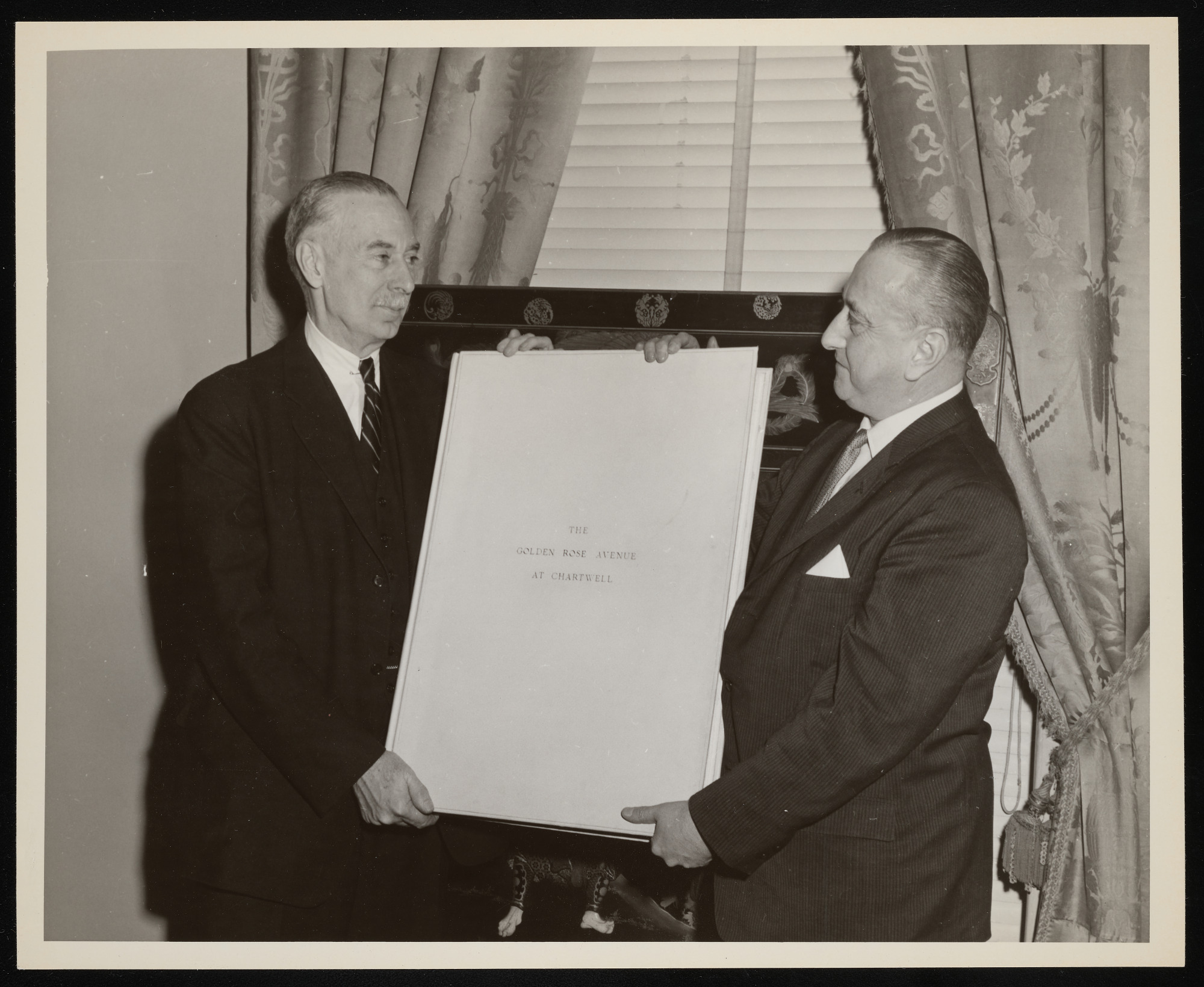 Presentation of "The Golden Rose Avenue at Chartwell" book, loaned by the Churchill family for special showing at "British Artist Craftsmen" special exhibition circulated by Smithsonian Traveling Exhibition Service, with Secretary Leonard Carmichael at left.