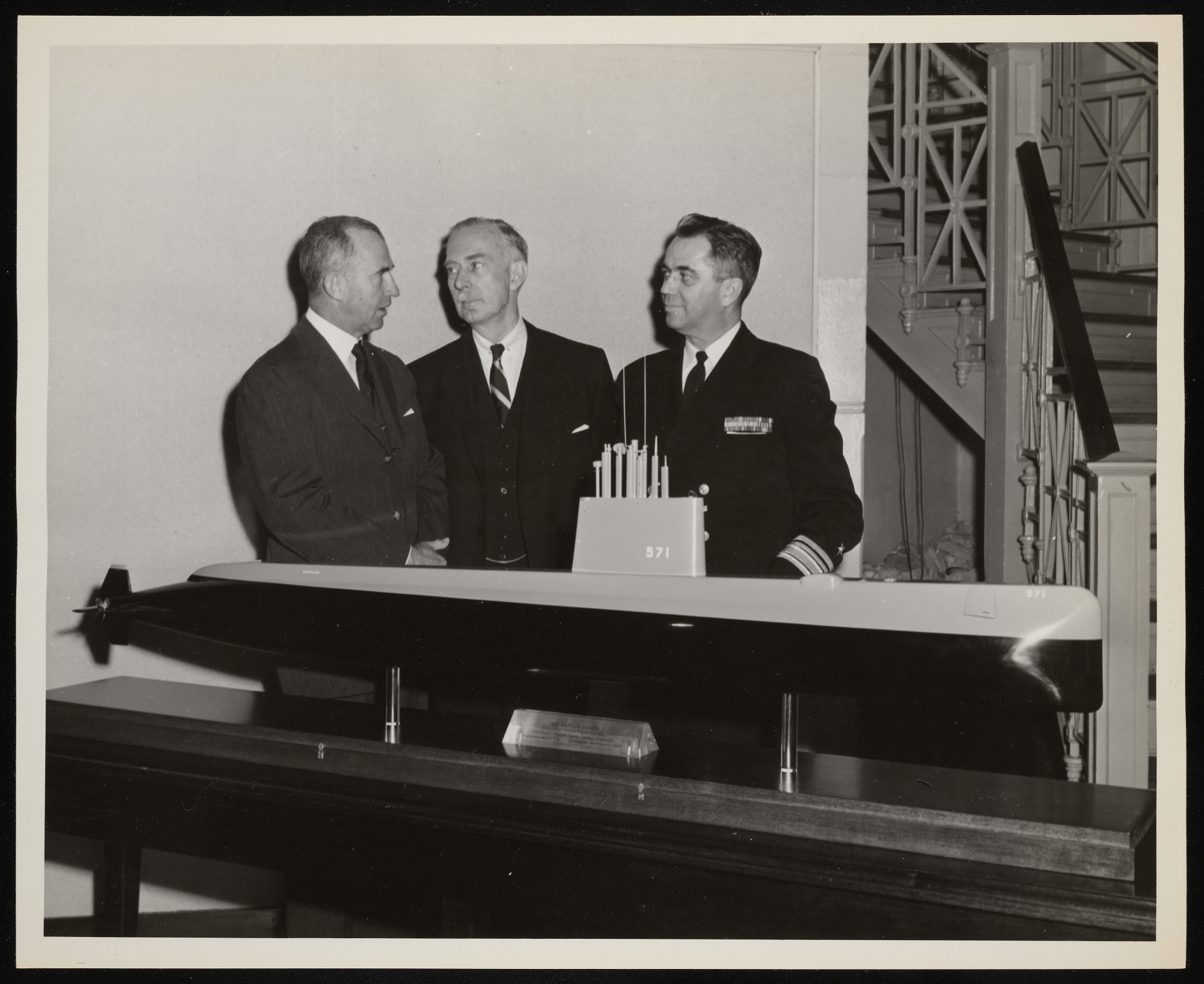 Model of nuclear-powered submarine USS Nautilus for special exhibition in the rotunda of the Arts and Industries Building, with Secretary Leonard Carmichael (center).