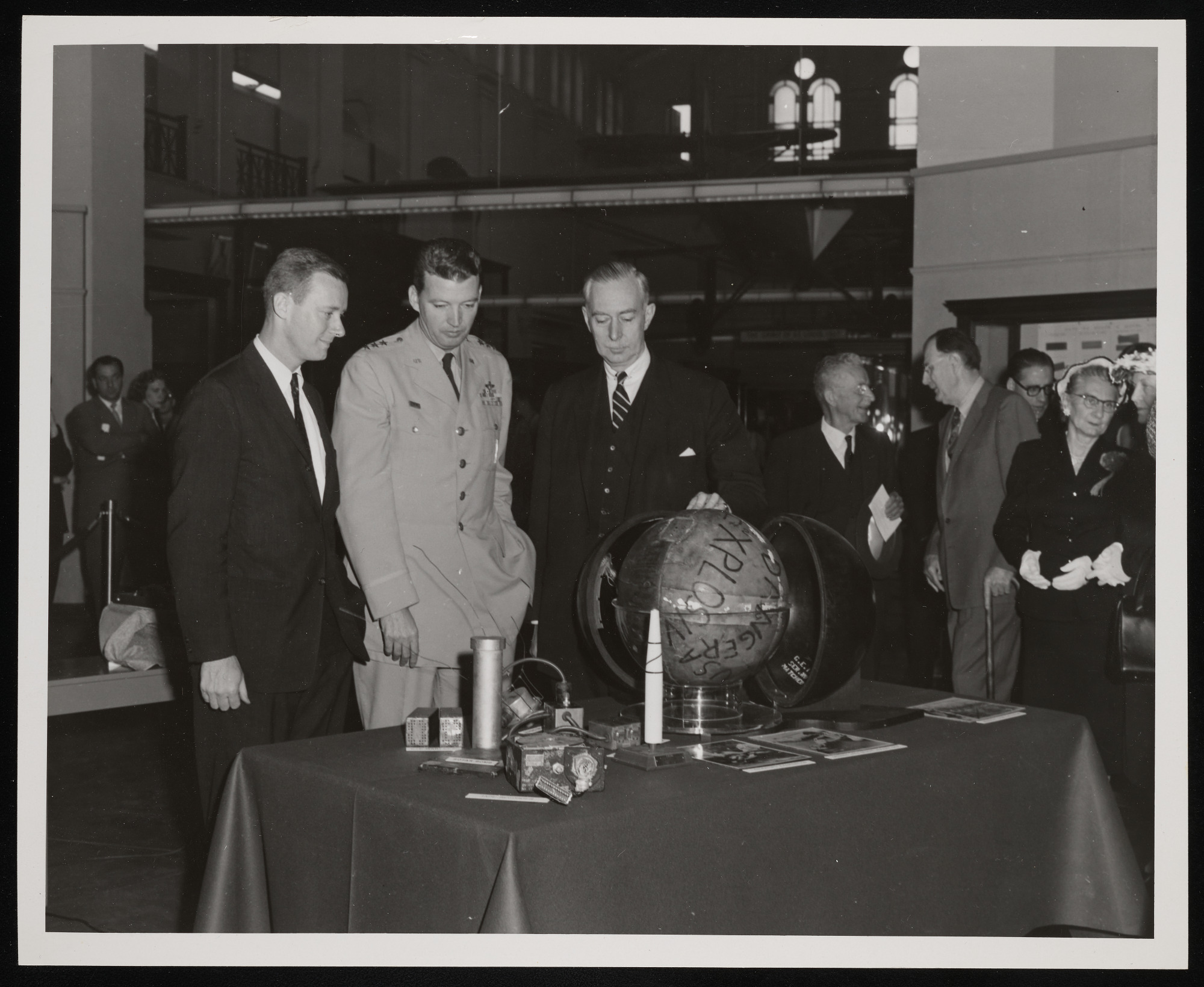 Presentation of the Datasphere, the first instrumented package to be recovered from space by the United States, to the National Air Museum by the United States Air Force in the rotunda of the Arts and Industries Building, with Bernard A. Schriever, commander of the Air Research and Development Command (in uniform); and Secretary Leonard Carmichael.