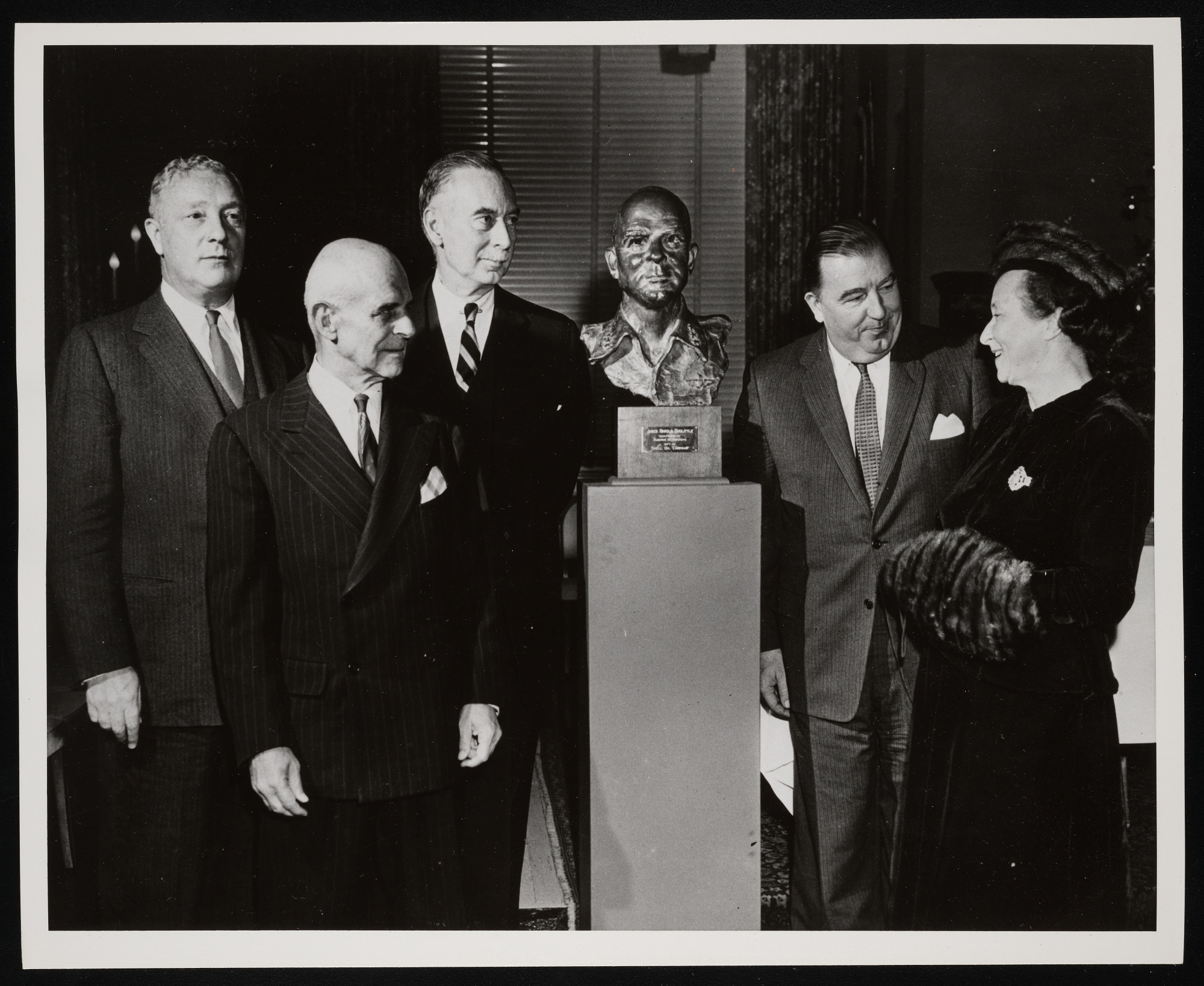 Presentation of bust of aviation pioneer General James "Jimmy" Doolittle sculptured by Suzanne Silvercruys Stevenson, a gift of Shell Oil Company to the National Air Museum, during ceremony at Washington Hotel, with H.S.M. Burns, president of Shell Oil, Jimmy Doolittle, Secretary Leonard Carmichael, unidentified man, and Suzanne Silvercruys Stevenson.