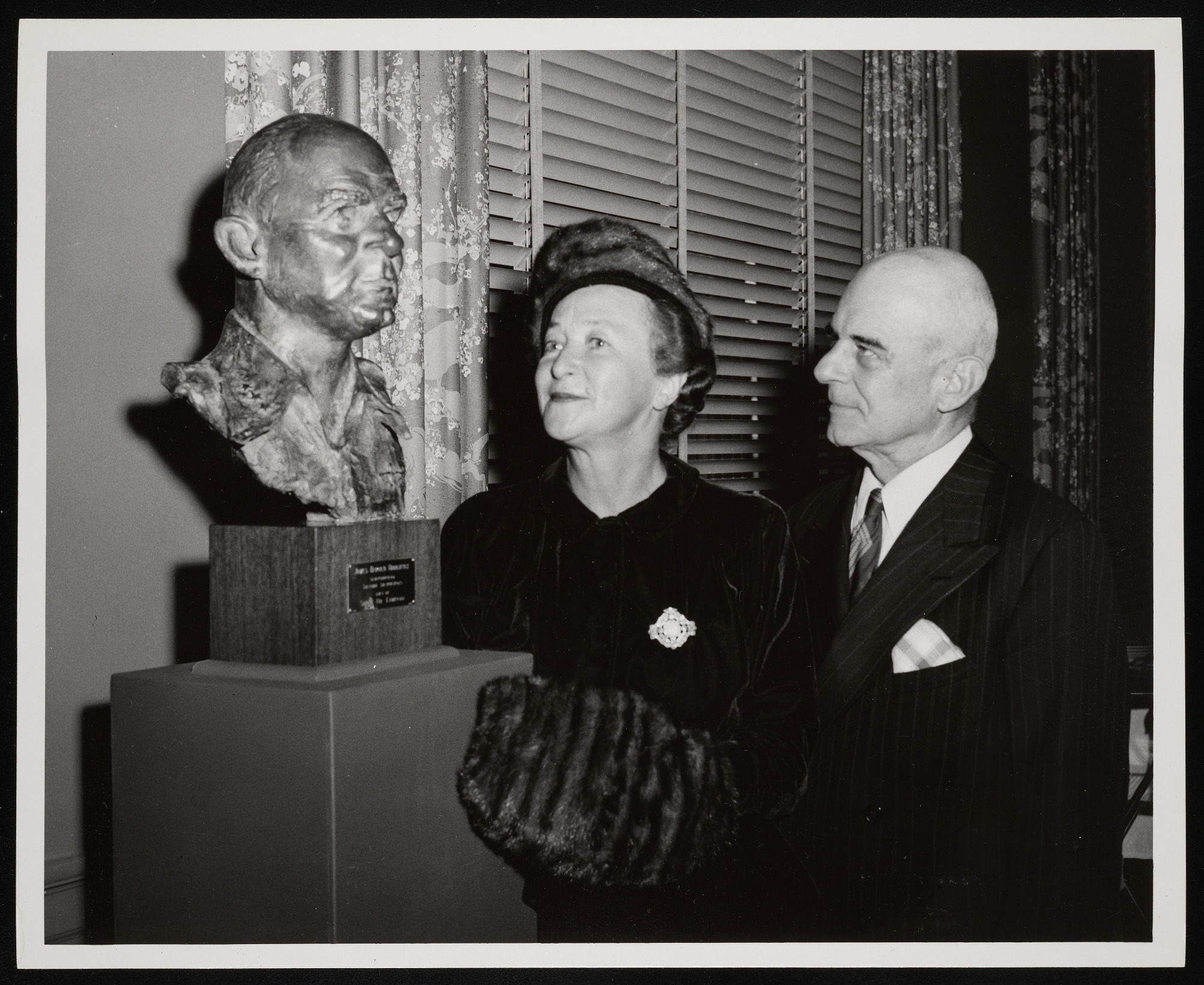 Presentation of bust of aviation pioneer General James "Jimmy" Doolittle sculptured by Suzanne Silvercruys Stevenson, a gift of Shell Oil Company to the National Air Museum, during ceremony at Washington Hotel, with Suzanne Silvercruys Stevenson and Jimmy Doolittle.