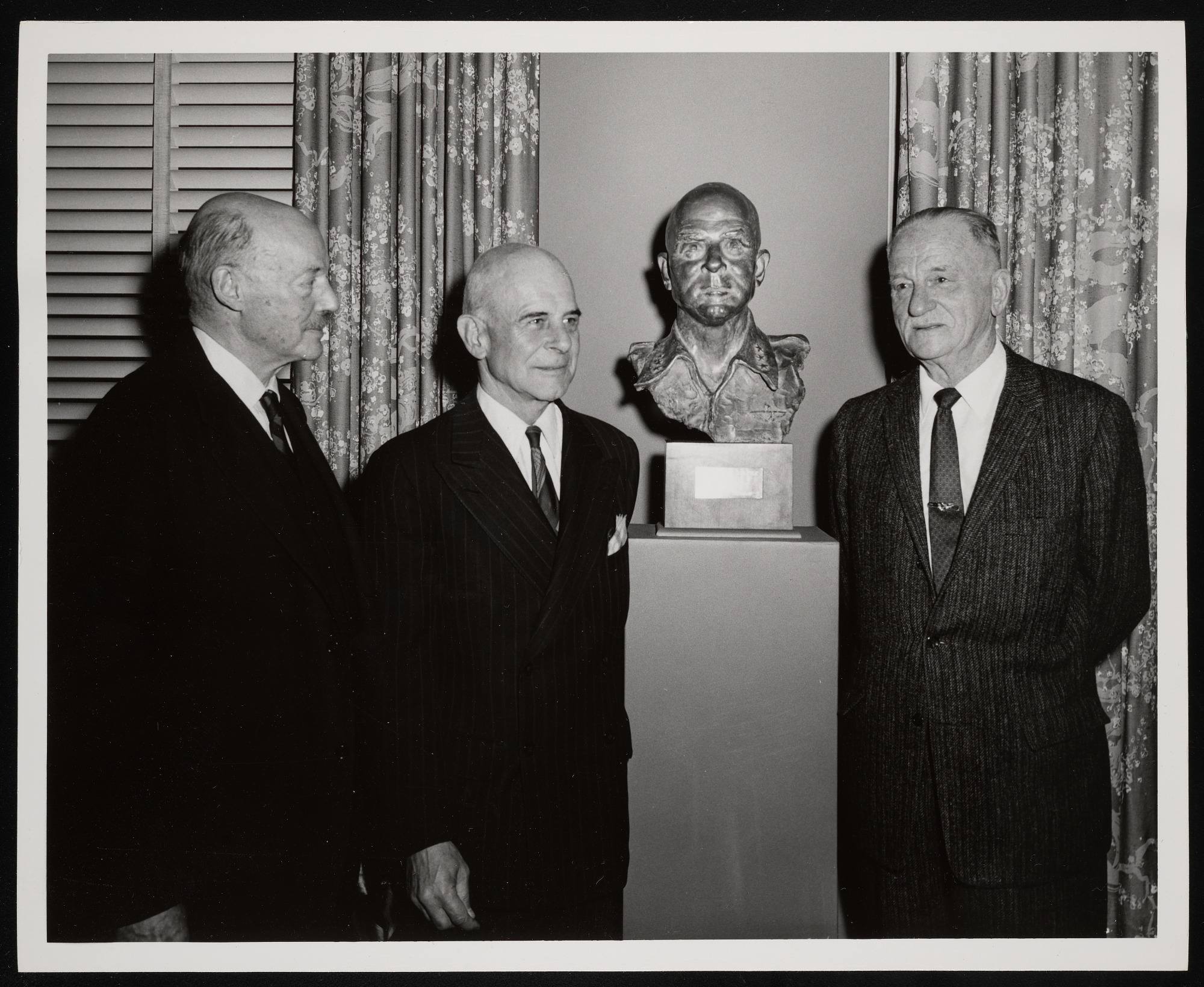 Presentation of bust of aviation pioneer General James "Jimmy" Doolittle sculptured by Suzanne Silvercruys Stevenson, a gift of Shell Oil Company to the National Air Museum, during ceremony at Washington Hotel, with Jimmy Doolittle (center).