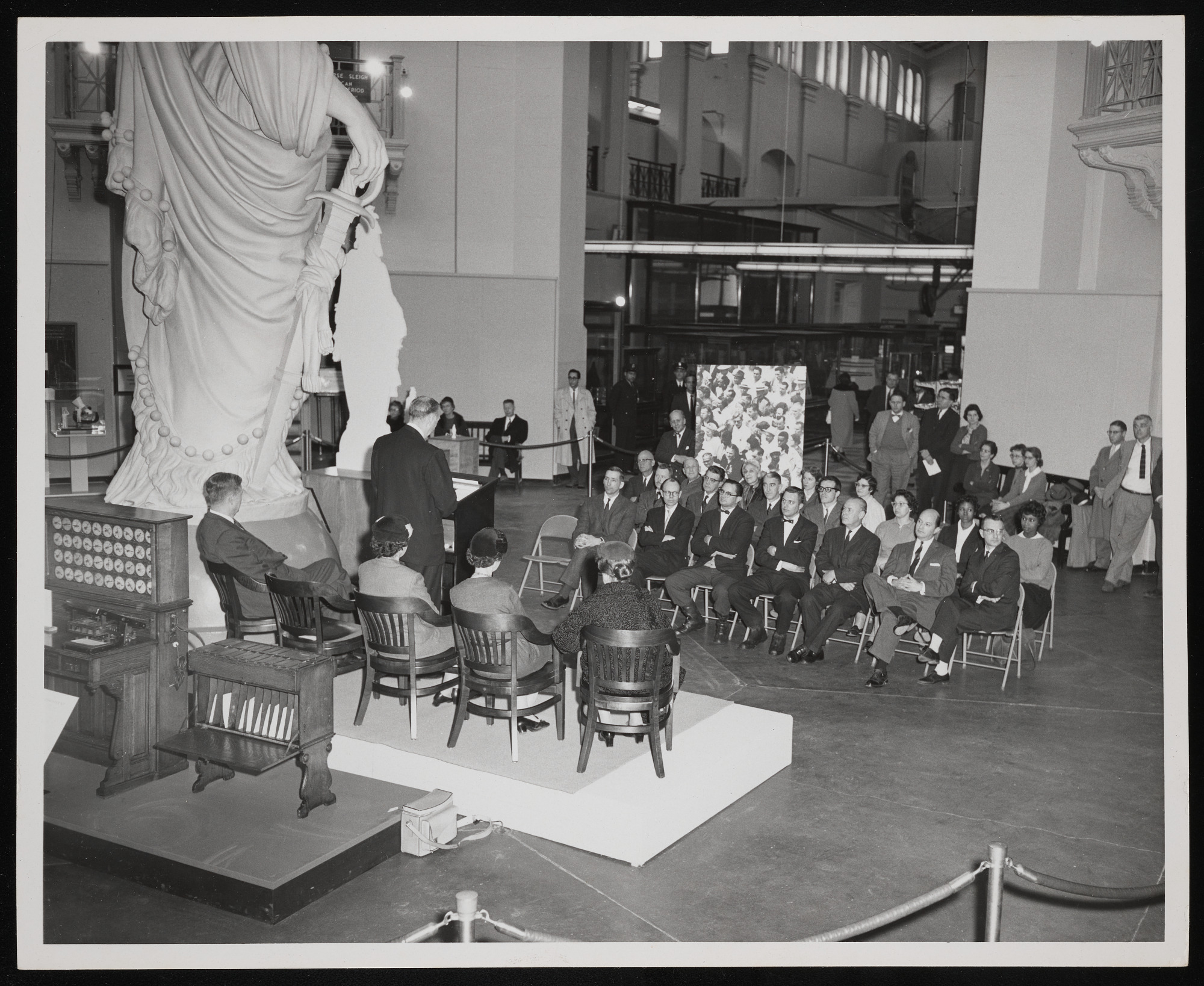 Opening of "The United States Census 1790-1960" special exhibition in the rotunda of the Arts and Industries Building, prepared by Division of Physical Sciences and the Bureau of the Census, with (seated on stage, left to right) Robert W. Burgess, director of the Census Bureau; Virginia Hollerith, Nan Hollerith, and Lucille Hollerith, daughters of Herman Hollerith, inventor of the punch card tabulating machine; and Secretary Leonard Carmichael (at podium).