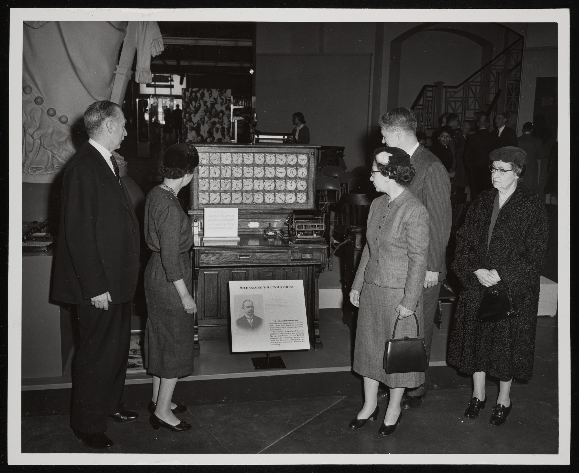 Opening of "The United States Census 1790-1960" special exhibition in the rotunda of the Arts and Industries Building, prepared by Division of Physical Sciences and the Bureau of the Census, with Secretary Leonard Carmichael; Nan Hollerith; Virginia Hollerith; Robert W. Burgess, director of the Census Bureau; and Lucile Hollerith.