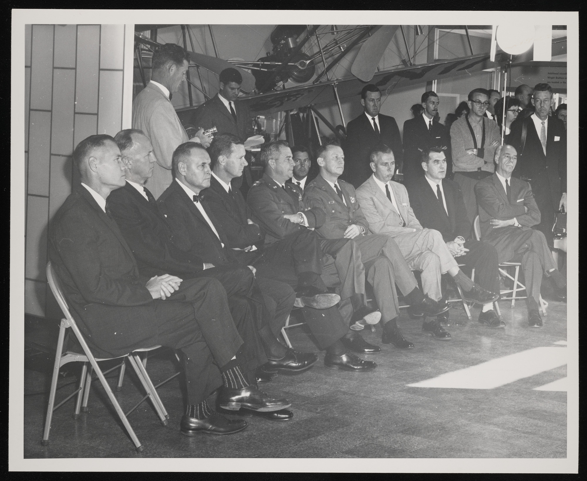 Presentation of RVX1-5 missile reentry nose cone, the first reentry nose cone to be recovered after a space flight of intercontinental range, to the National Air Museum (NAM) by United States Air Force (USAF), with Philip S. Hopkins, NAM director (seated, far right).
