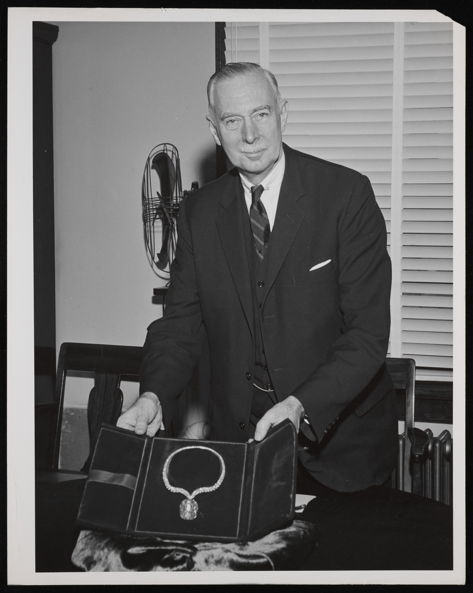 Presentation of Jubilee Diamond, on loan to the Museum of Natural History for eight months, by industrialist and philanthropist Paul-Louis Weiller, with Secretary Leonard Carmichael.