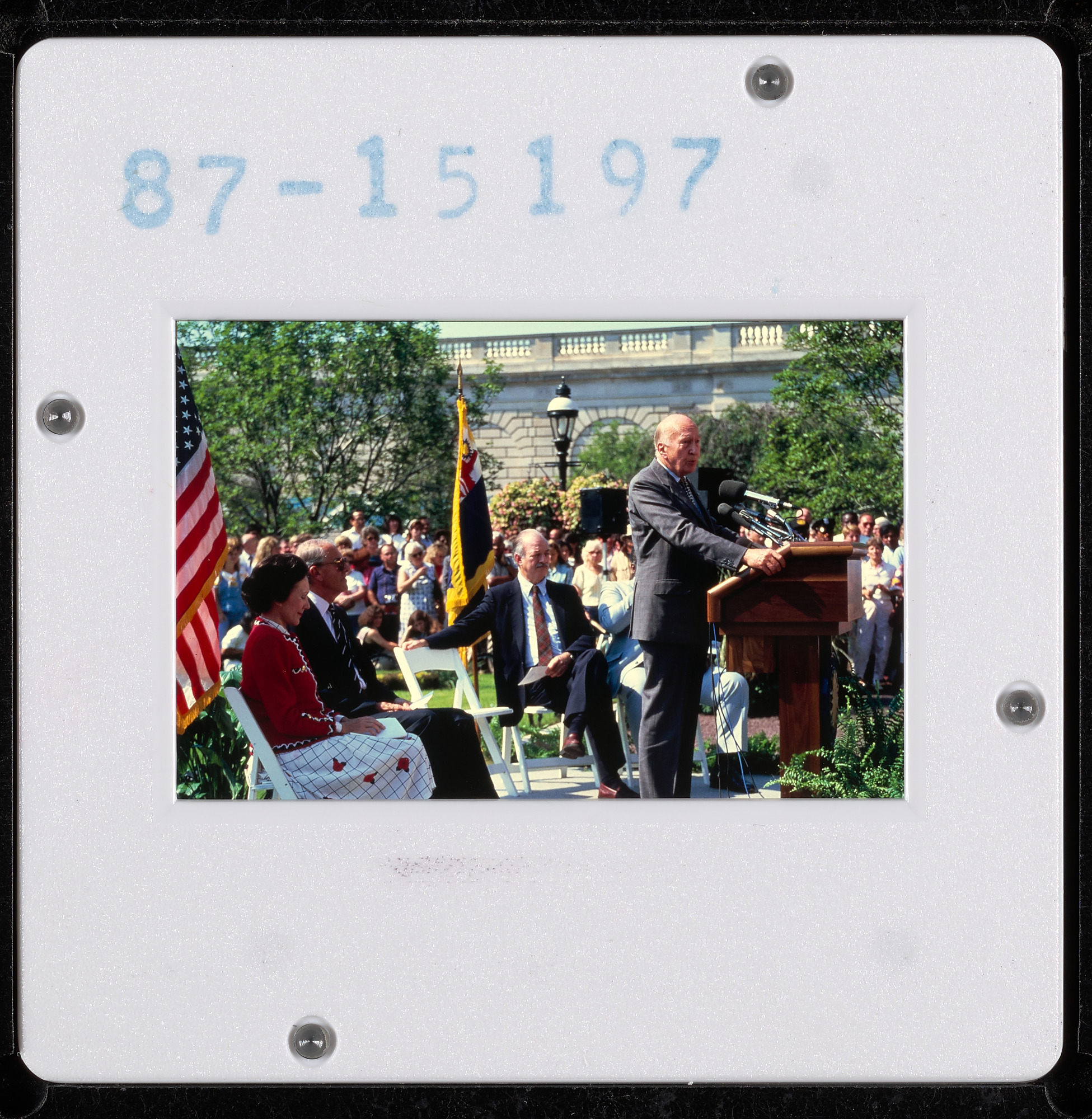With S. Dillon Ripley, former Smithsonian secretary, at podium; Anne L. Armstrong, Smithsonian regent, seated; Jean Paul Carlhian, architect and principal designer of the Quadrangle museum complex, seated; and Secretary Robert McCormick Adams, seated.