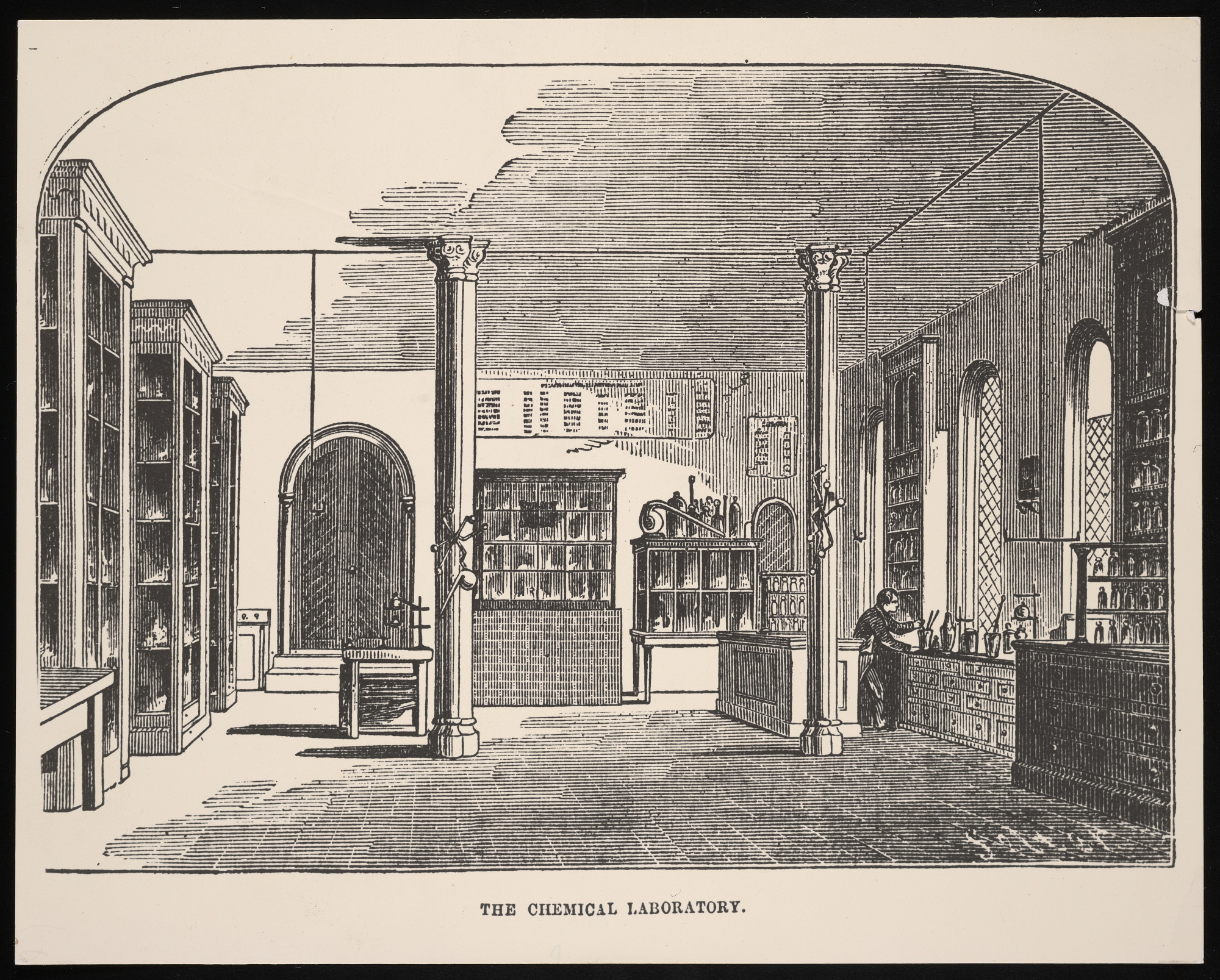 Woodcut, interior view of the Chemical Laboratory in the Smithsonian Institution Building, or Castle.