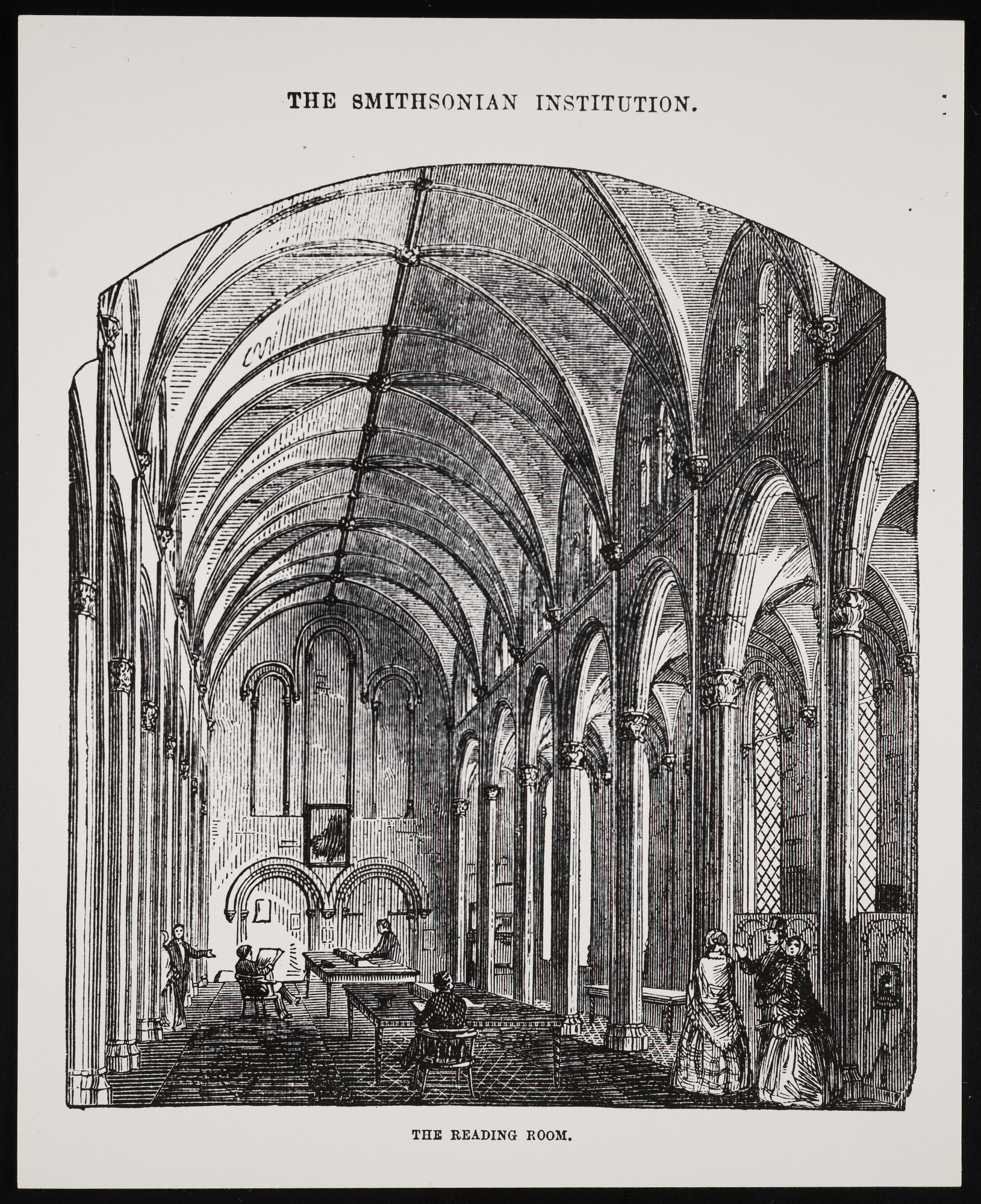 Woodcut, interior view of the Reading Room in the West Range of the Smithsonian Institution Building, or Castle.