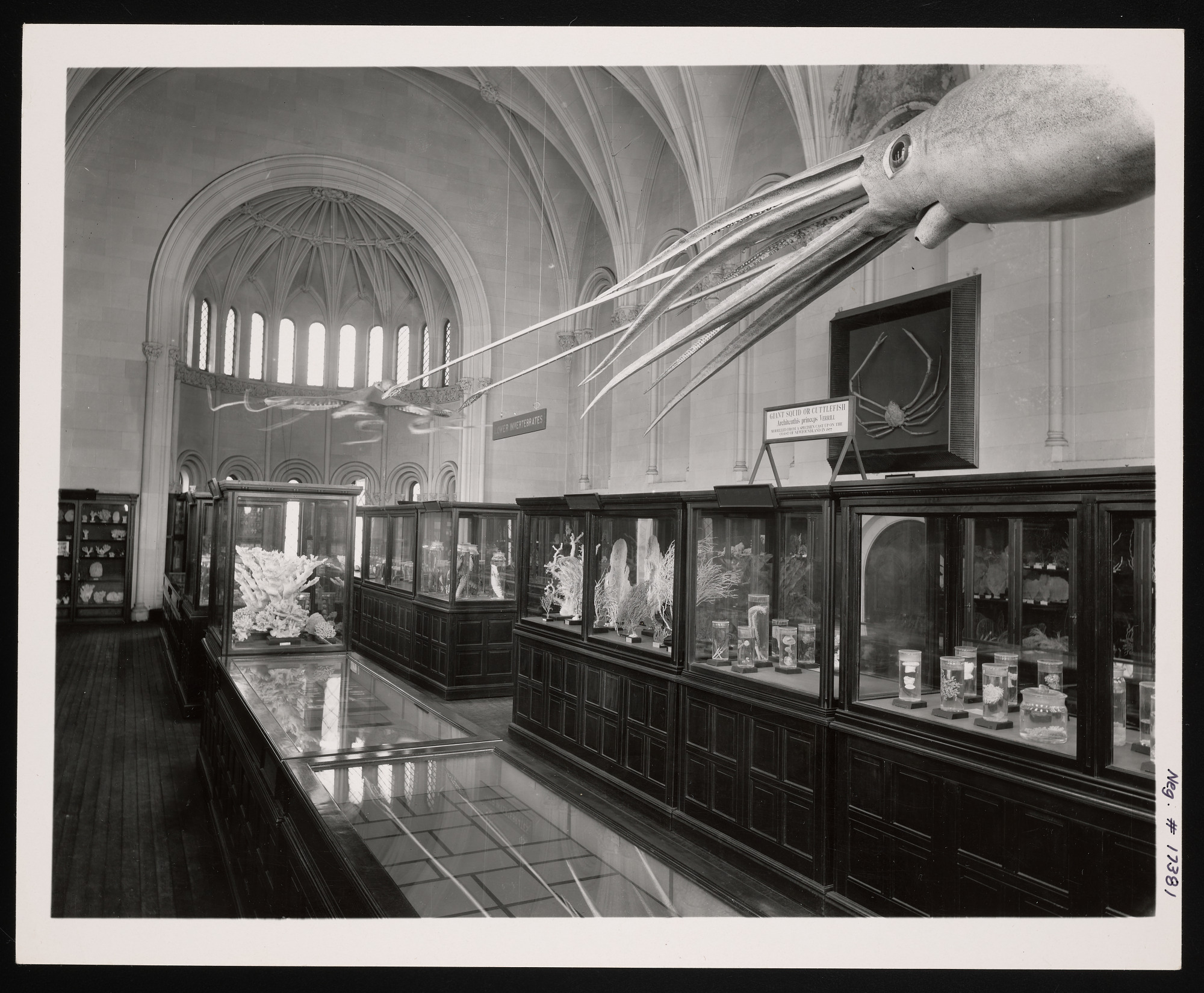 Interior view of the west wing, also known as the chapel, of the Smithsonian Institution Building, or Castle, showing marine invertebrates exhibits.