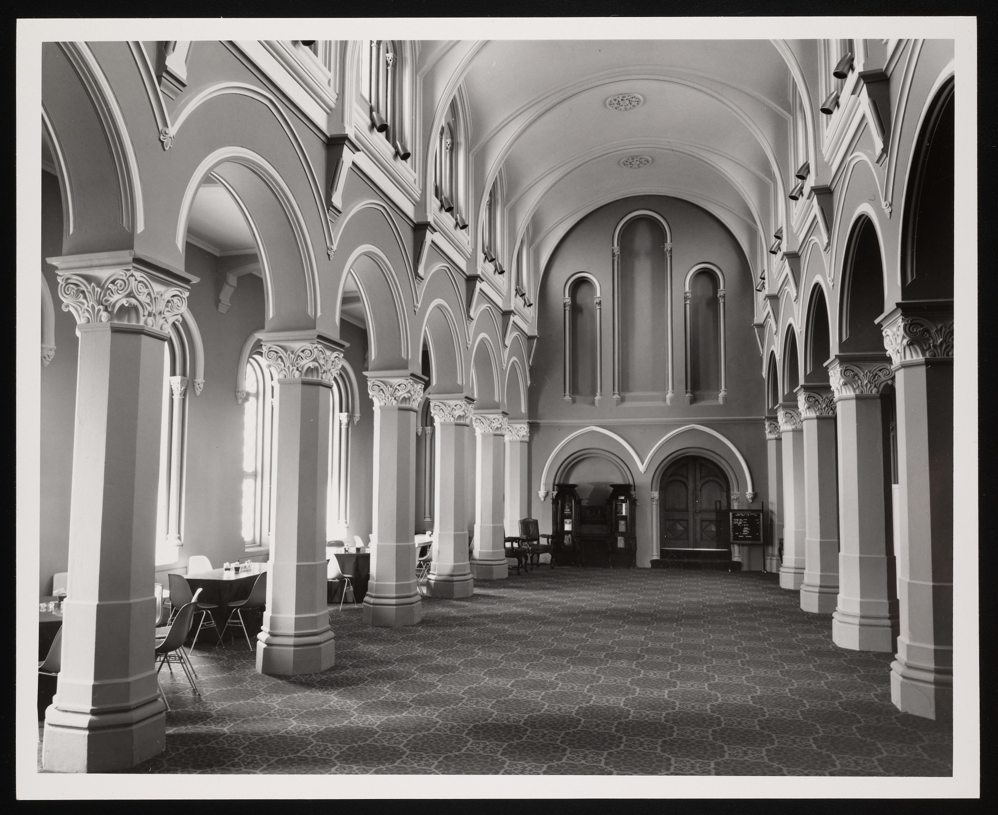 Interior view, reception area for SI Commons in the West Range, looking west, in the Smithsonian Institution Building, or Castle.