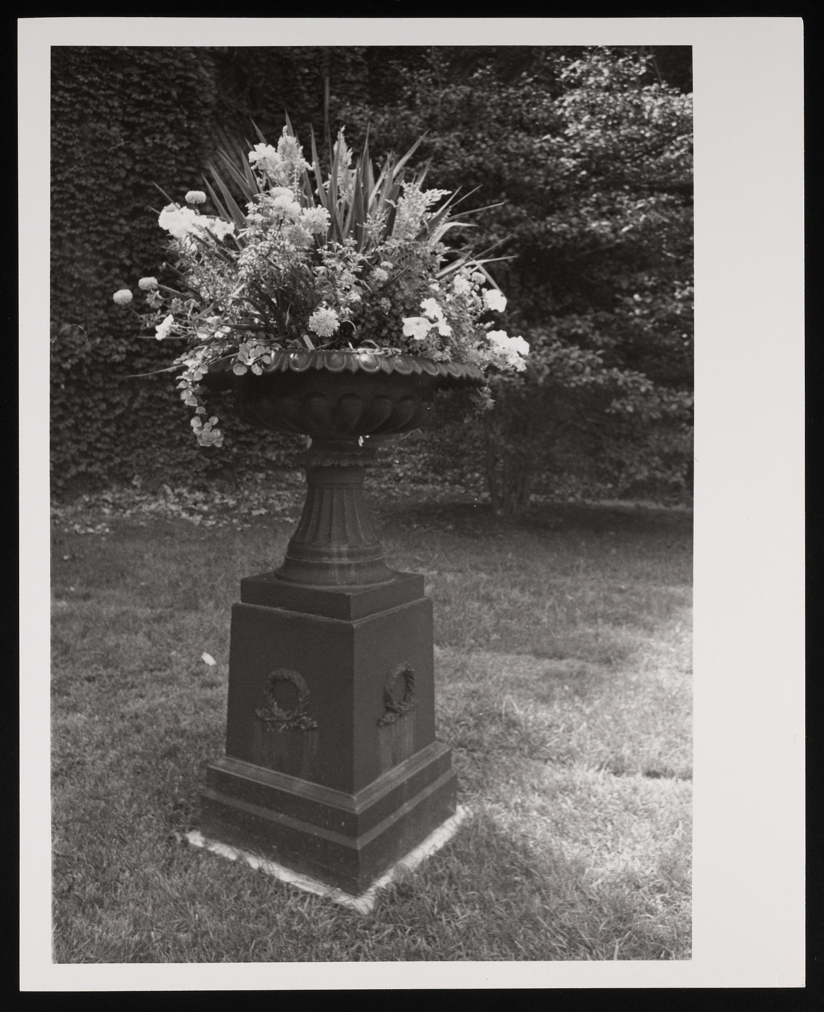 Garden urn with flower arrangement.