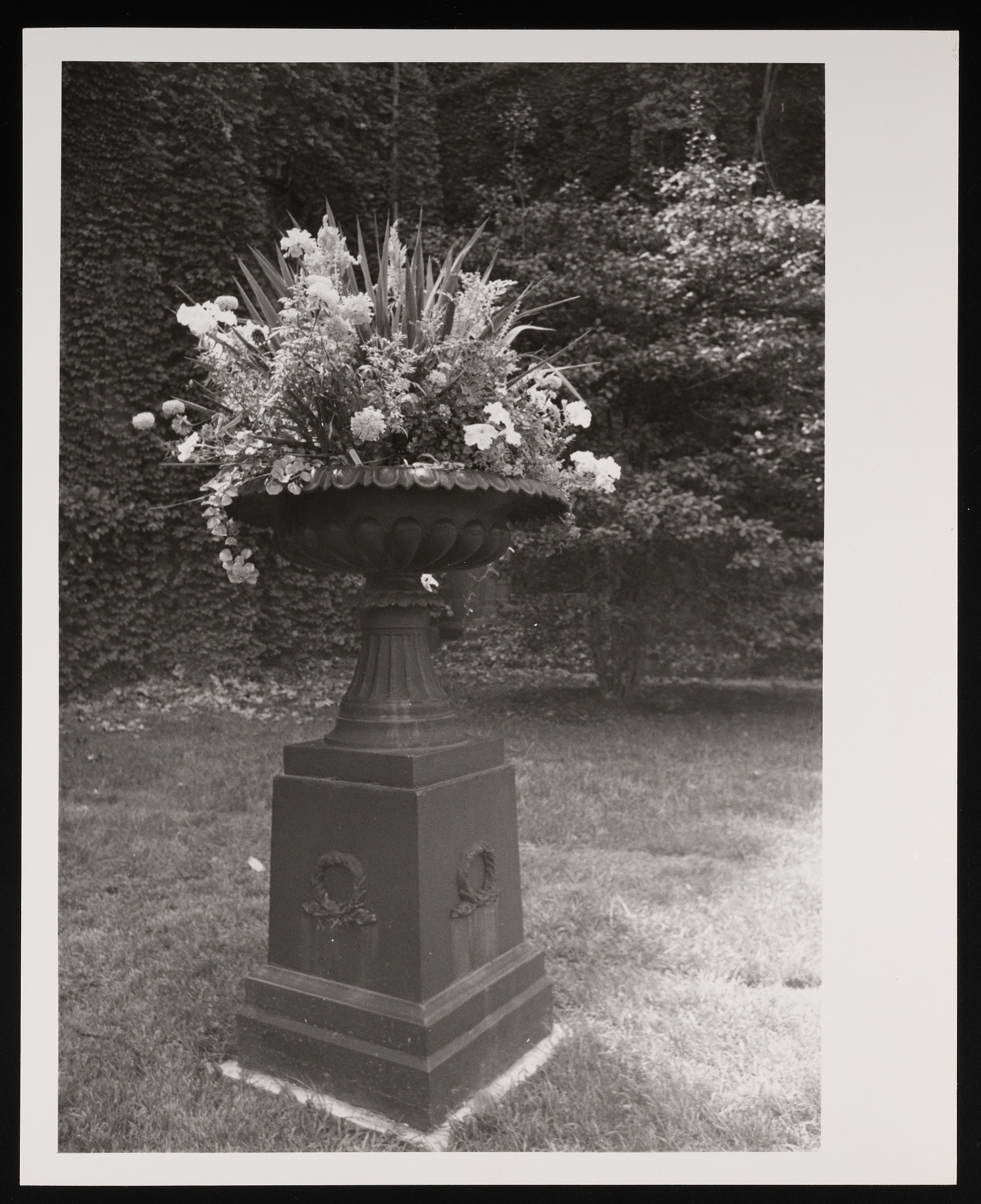 Garden urn with flower arrangement.