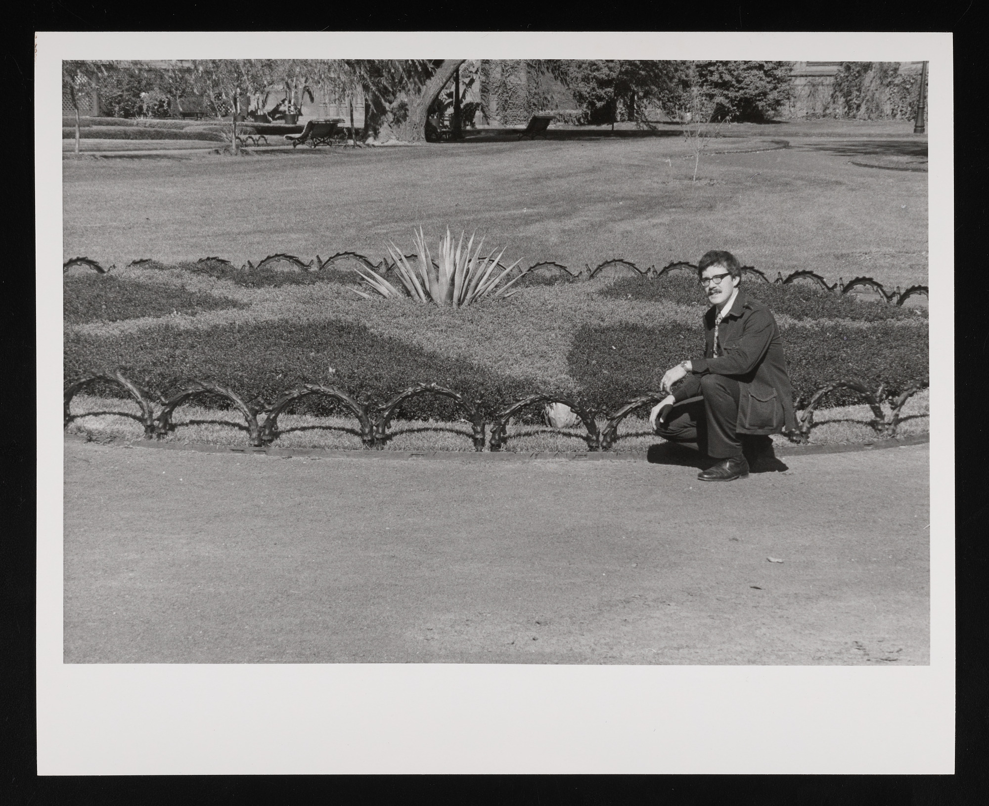 James R. Buckler, chief of the Office of Horticulture, poses in the Victorian Garden in the South Yard of the Smithsonian Institution Building, or Castle.