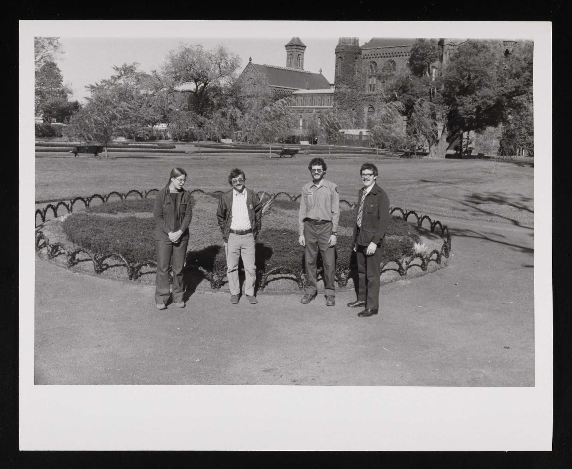 Group portrait of Office of Horticulture staff in the Victorian Garden in the South Yard of the Smithsonian Institution Building, or Castle, with chief horticulturist James R. Buckler (in suit and tie).