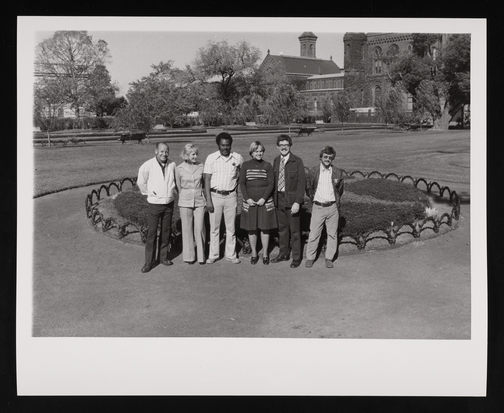 Group portrait of Office of Horticulture staff in the Victorian Garden in the South Yard of the Smithsonian Institution Building, or Castle, with chief horticulturist James R. Buckler (in suit and tie).