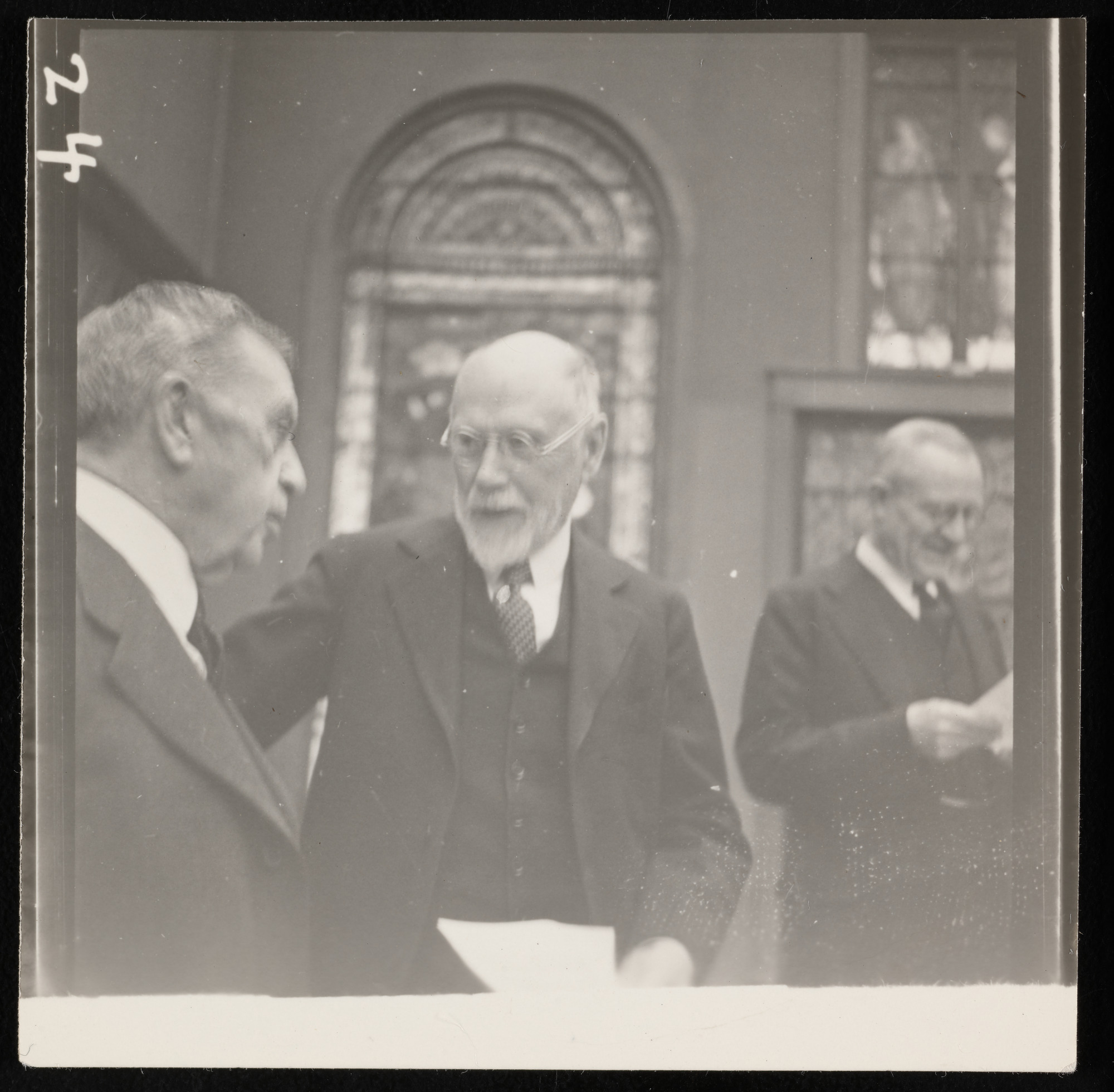 Recently installed stained glass windows "Peacocks and Peonies I," by John La Farge, visible in background, Gallery 3, Natural History Building, with Herbert Adams (center).