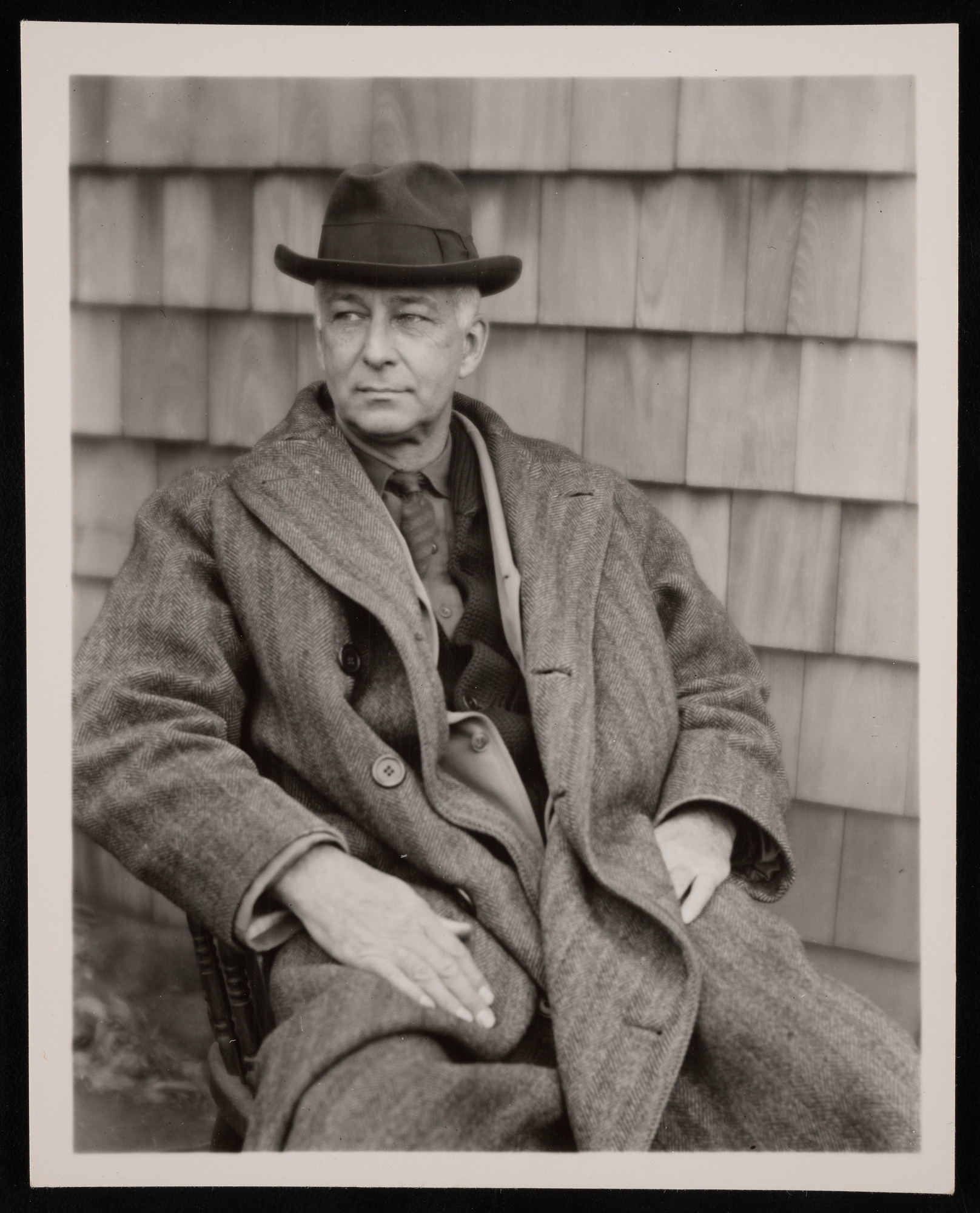Seated outside of Winnemana Lodge, a cabin and clubhouse constructed on Plummers Island for use by the Washington Biologists' Field Club.
