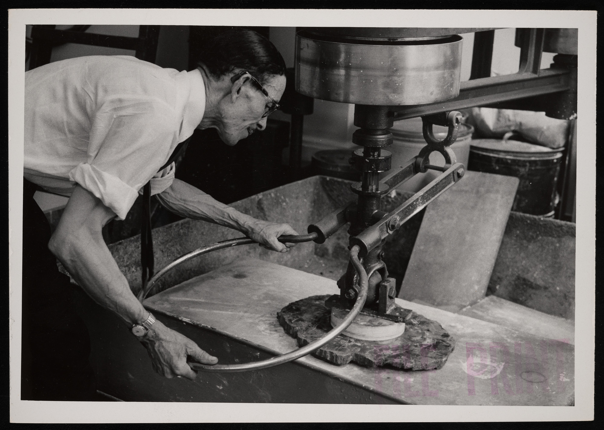 Bob Jones, of the Division of Mineralogy and Petrology, cuts stone, Department of Geology, Museum of Natural History.