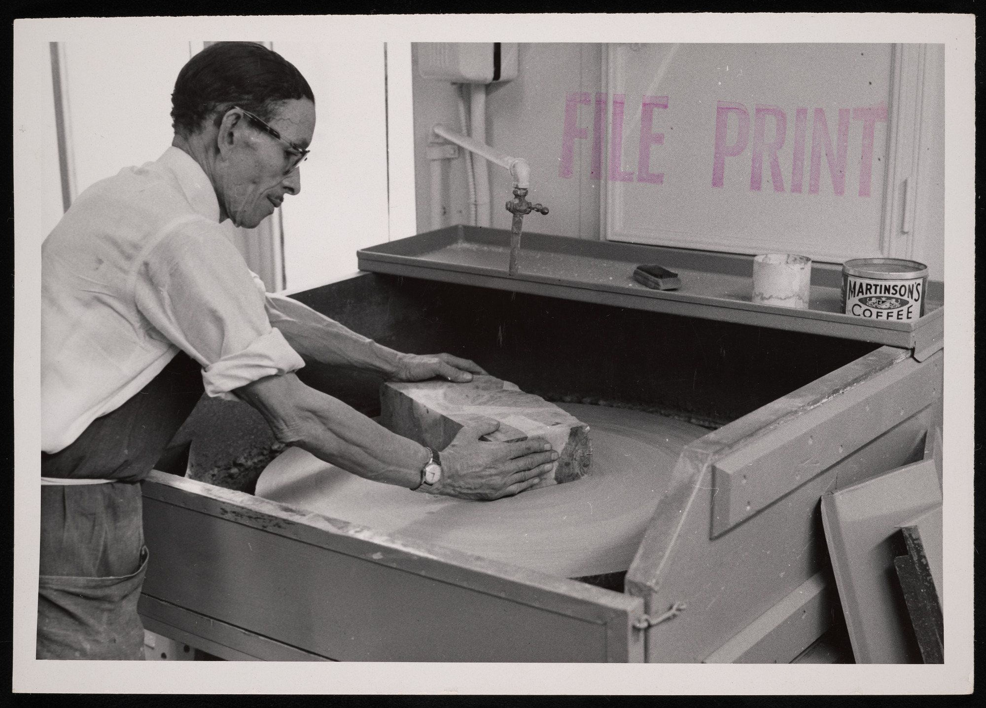 Bob Jones, of the Division of Mineralogy and Petrology, polishes stone, Department of Geology, Museum of Natural History.