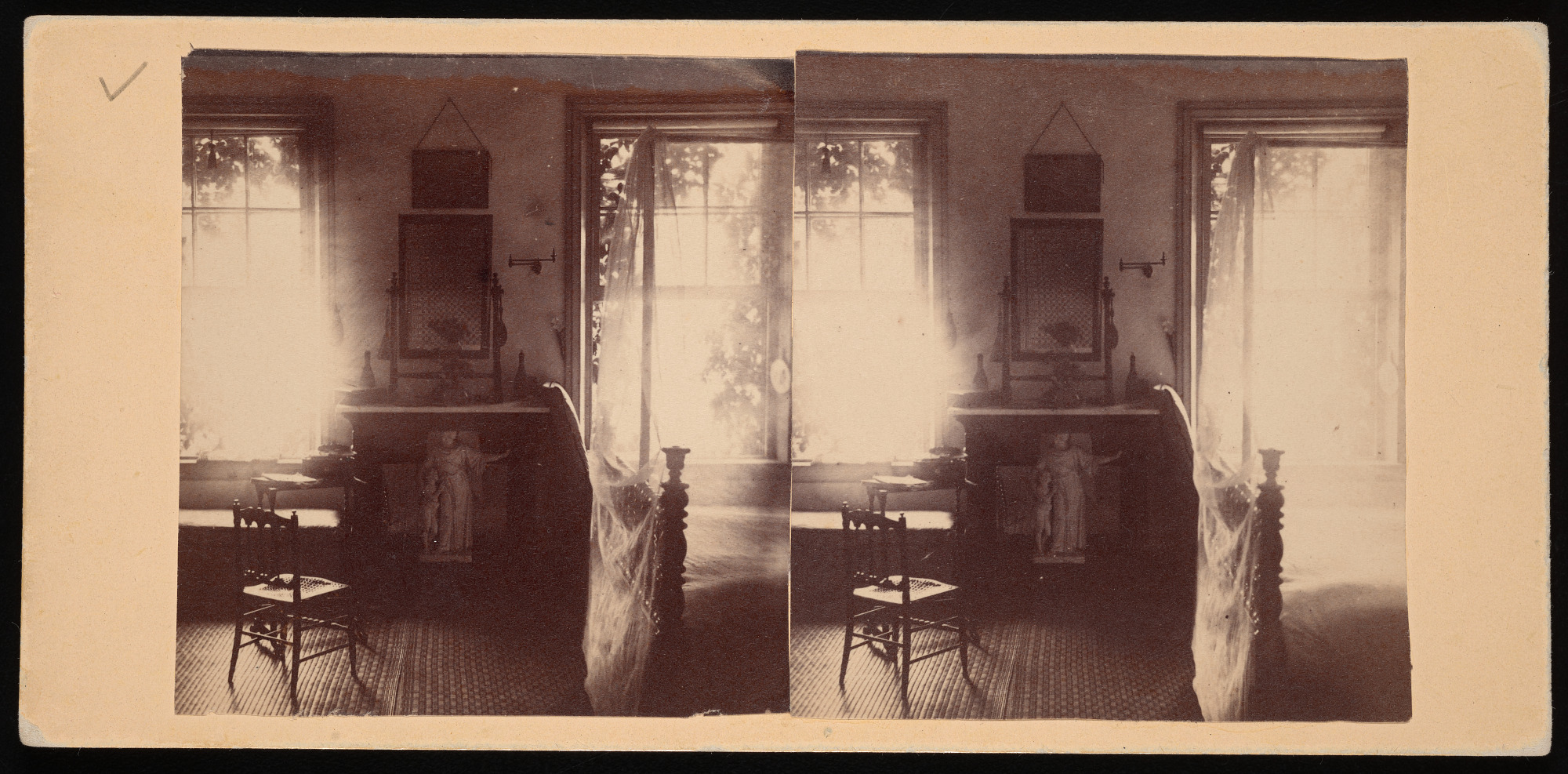 Interior view, mosquito netting and medallion in window of second floor back chamber of residence of Titian Ramsay Peale, G Street, Washington, D.C.
