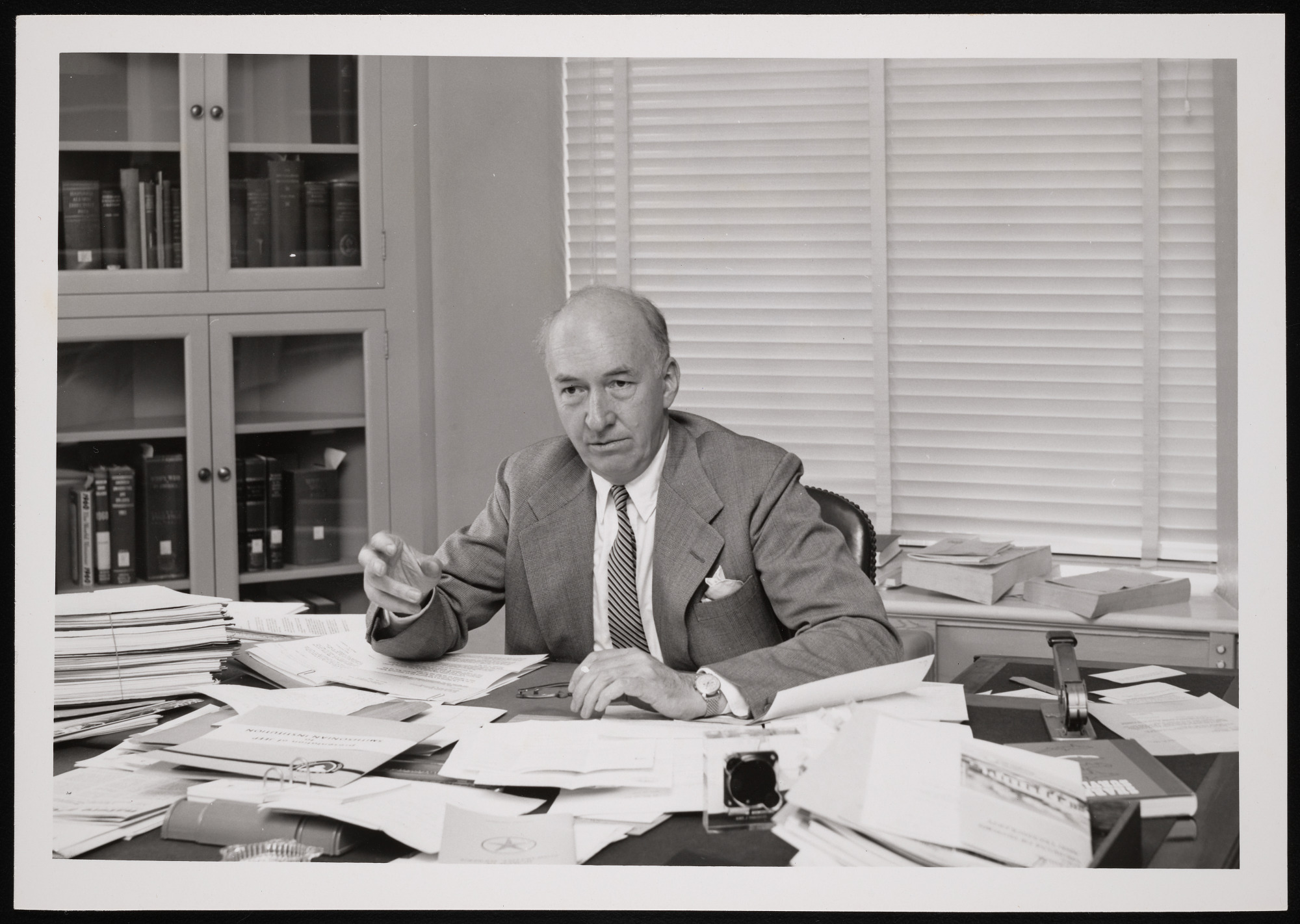 At desk in office in the Smithsonian Institution Building, or Castle.